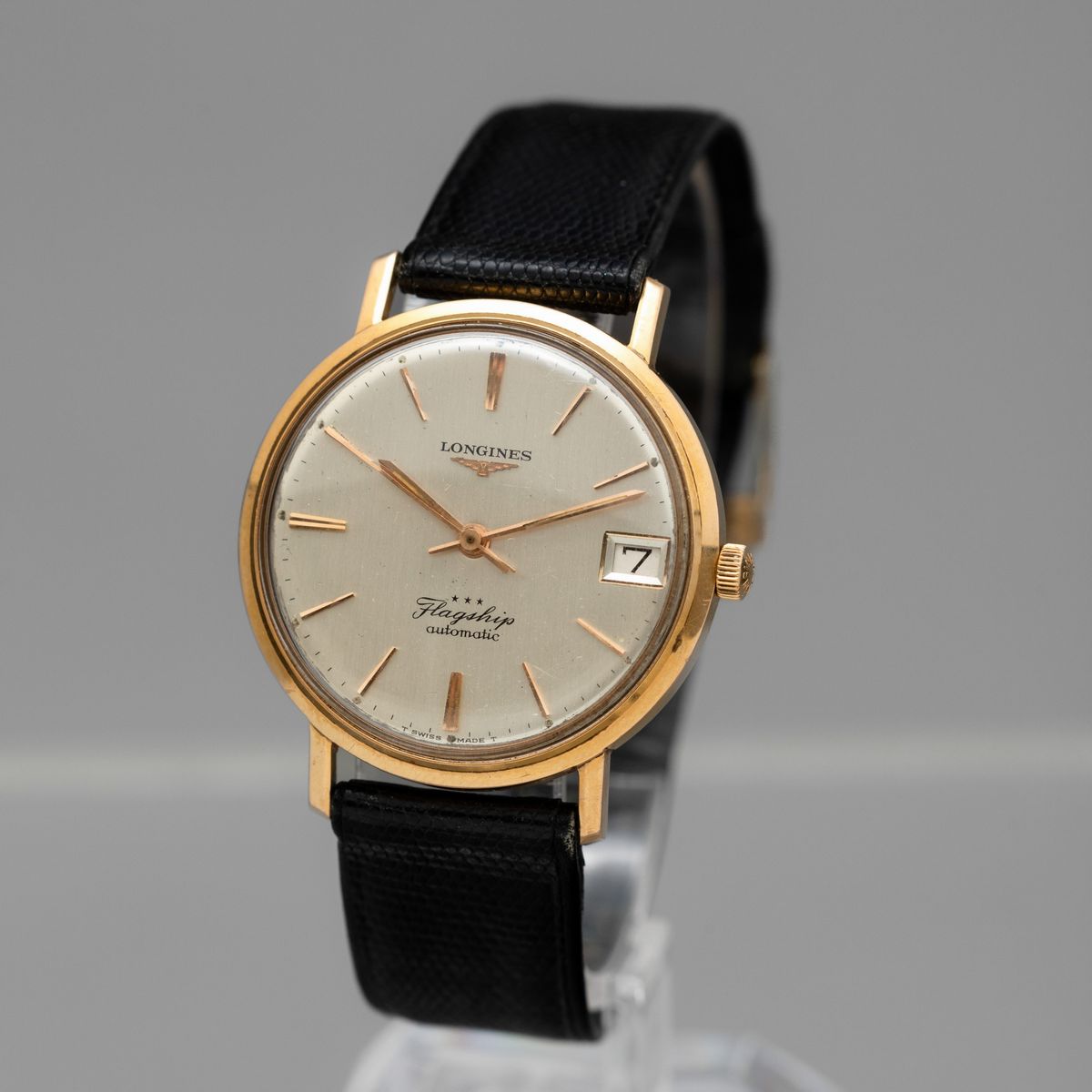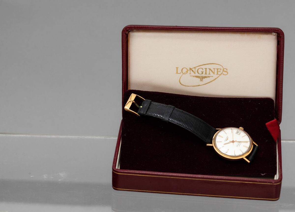LONGINES - Flagship automatico in oro 18k con datario, quadrante argentè e astuccio dell'epoca