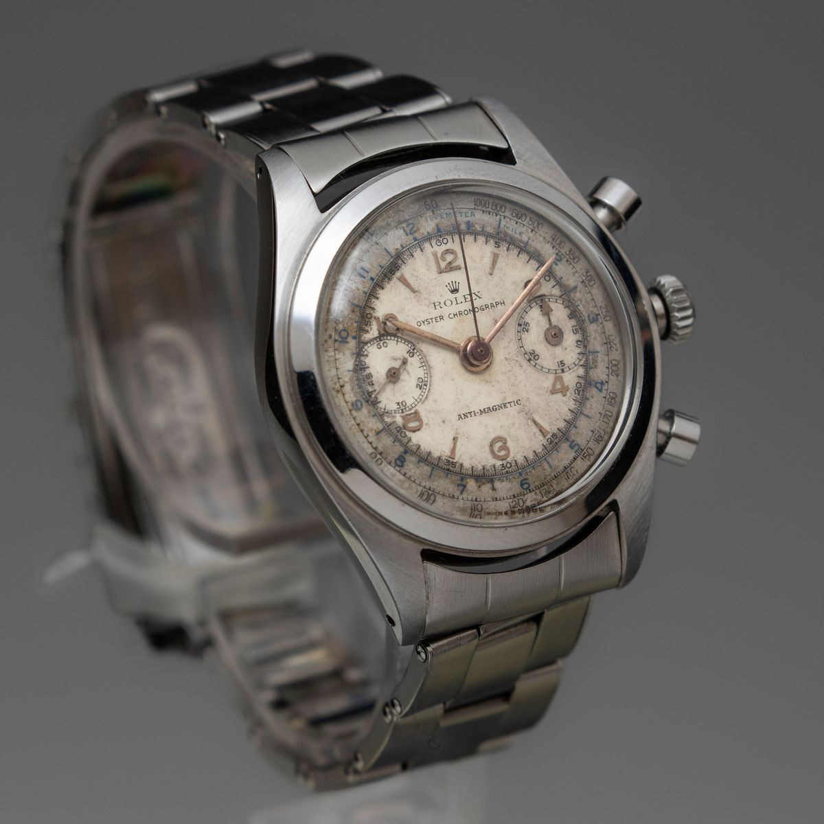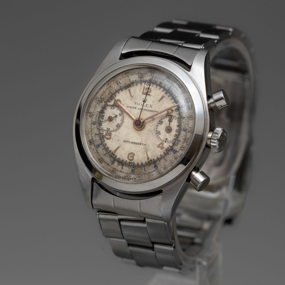 ROLEX - Cronografo due contatori "Monoblocco" ref 4500 in acciaio con bracciale rivettato, quadrante originale patinato
