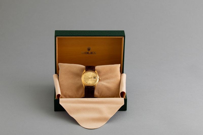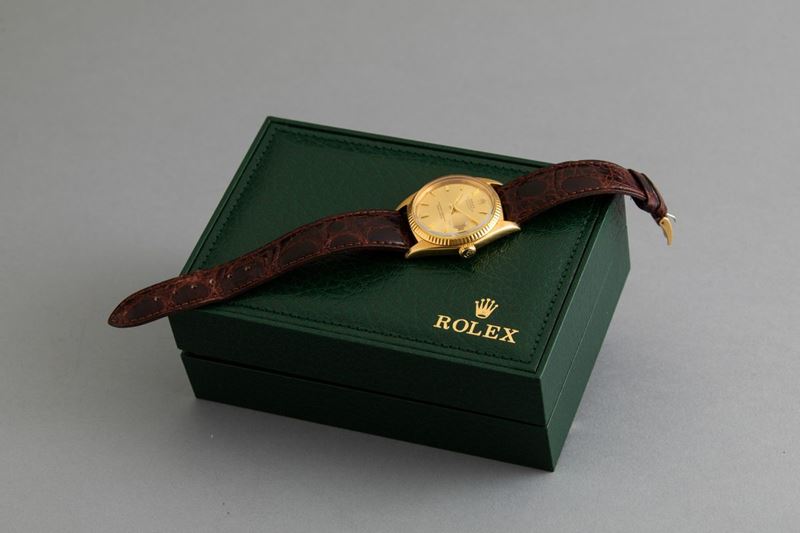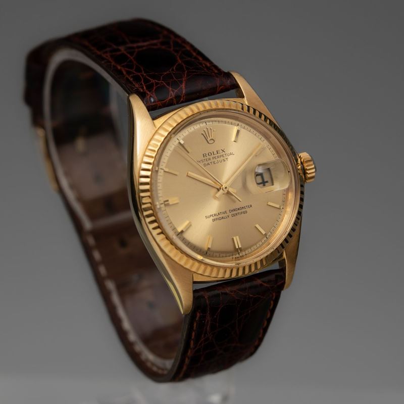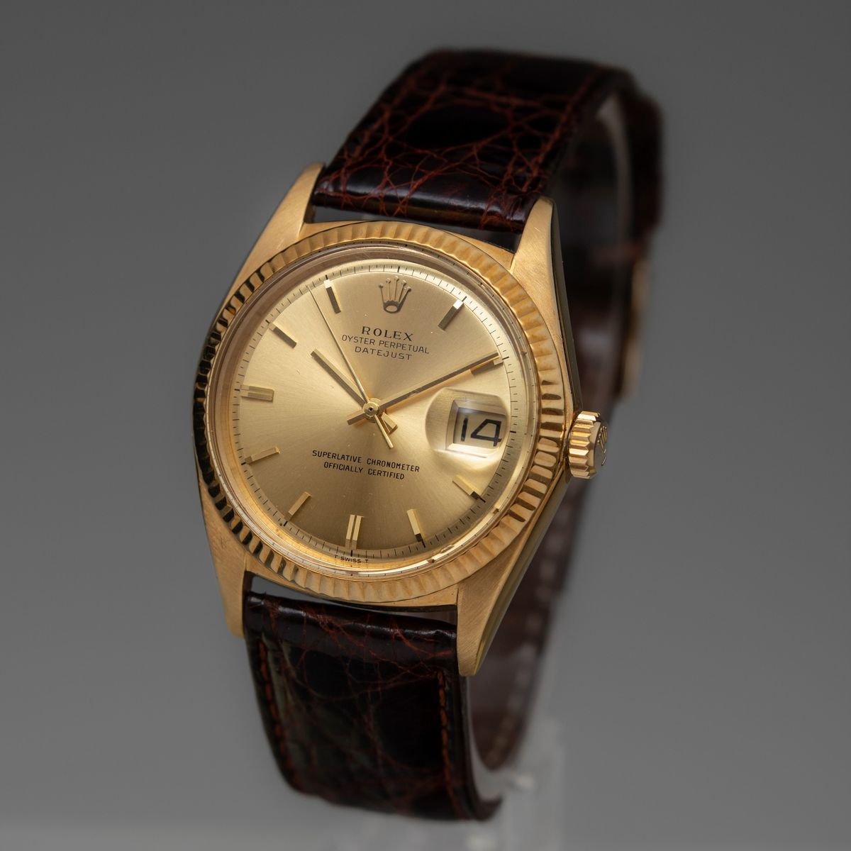 ROLEX - Datejust ref 1601 in oro 18k con quadrante champagne indici a bastone e cinturino in pelle.