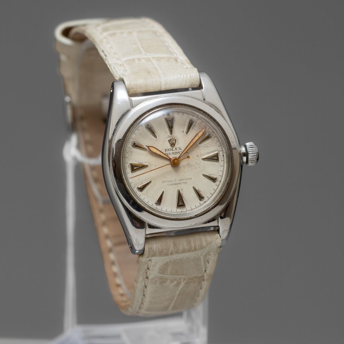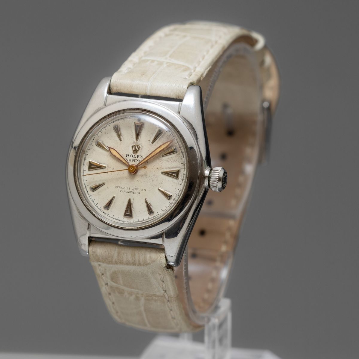 ROLEX - Ovetto ref 2940 in acciaio, automatico con quadrante Argentè indici applicati e cinturino in pelle con fibbia Rol [..]