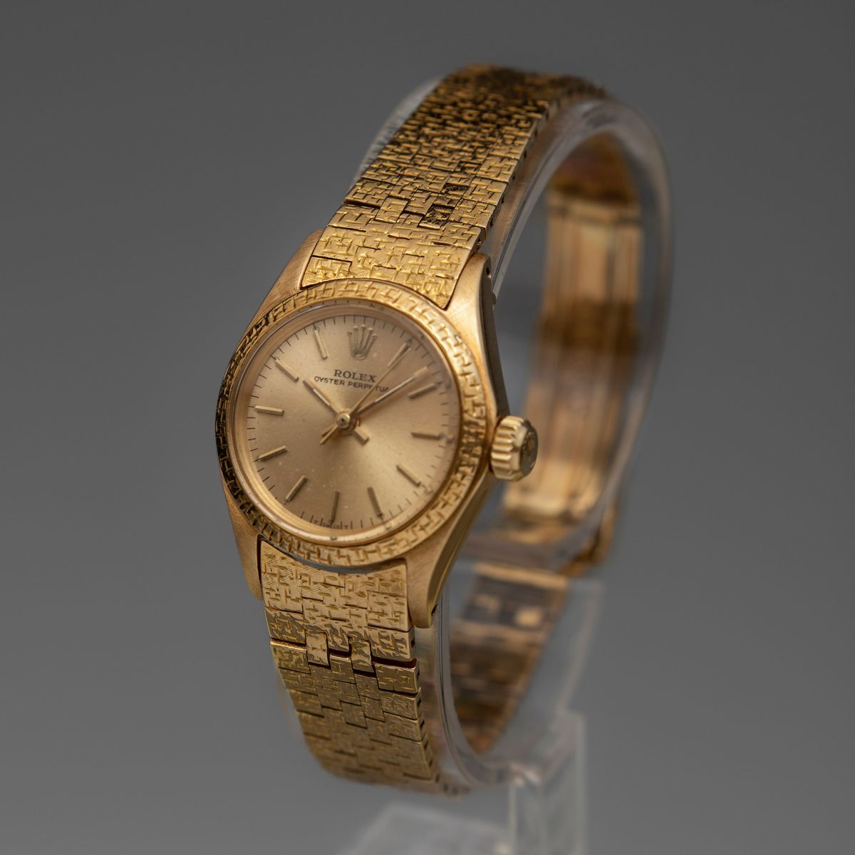 ROLEX - Raro Oyster Perpetual ref 6802 Lady in oro 18k con quadrante champagne, bracciale a maglie piatte e ghiera incisa