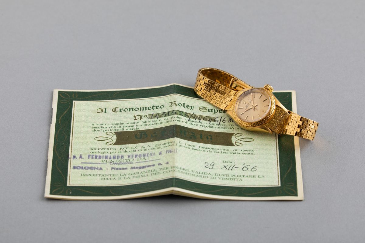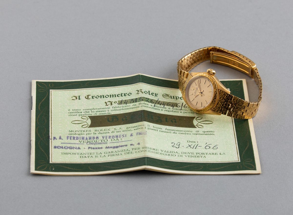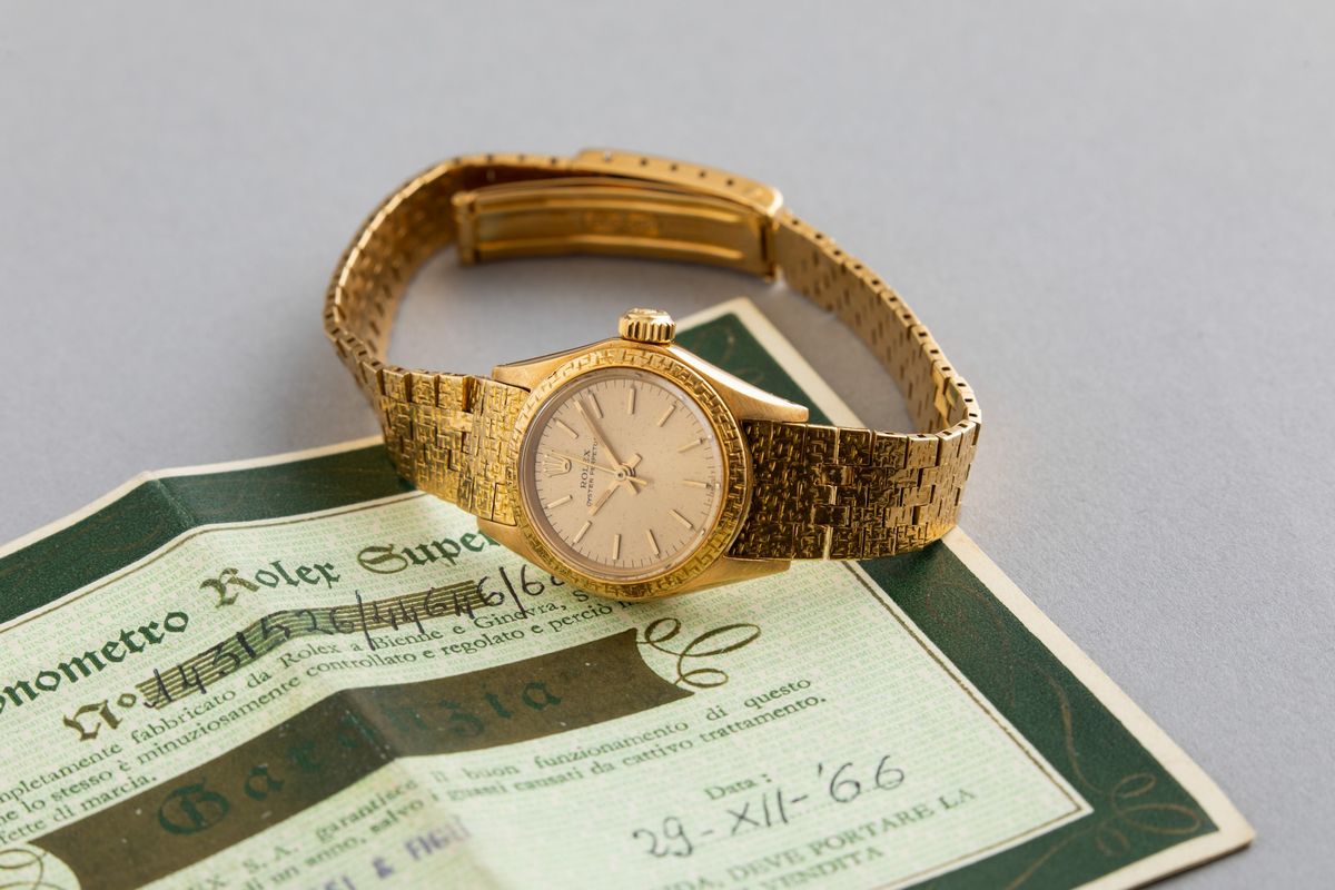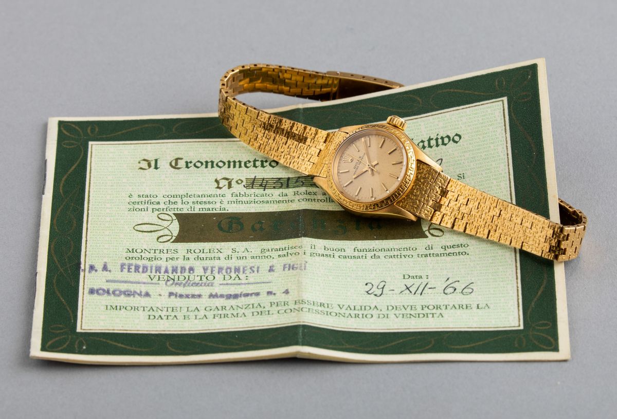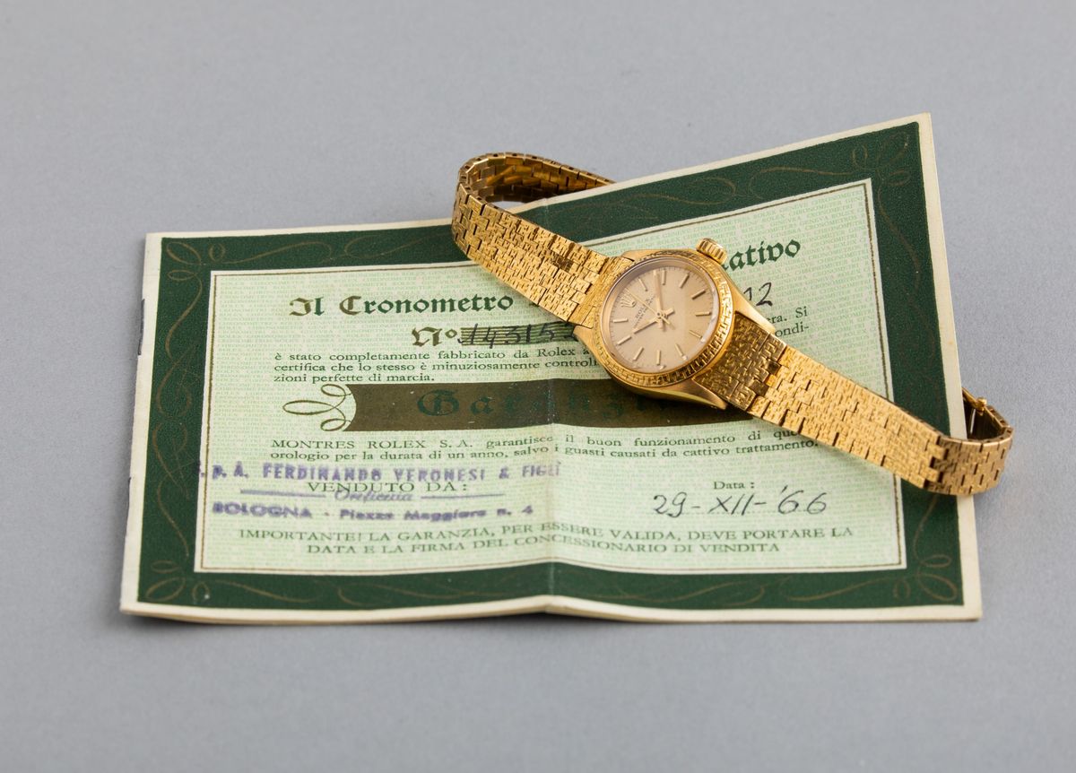 ROLEX - Raro Oyster Perpetual ref 6802 Lady in oro 18k con quadrante champagne, bracciale a maglie piatte e ghiera incisa [..]