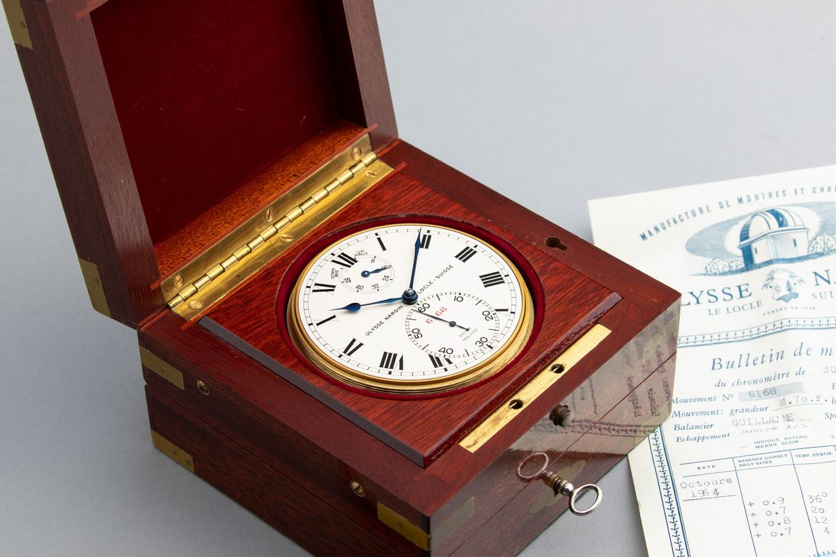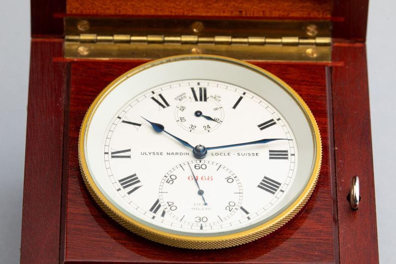 ULYSSE NARDIN - "Chronometre du Bord", raro deck-watch da Marina in ottone dorato con scatola in legno nautico laccato e [..]
