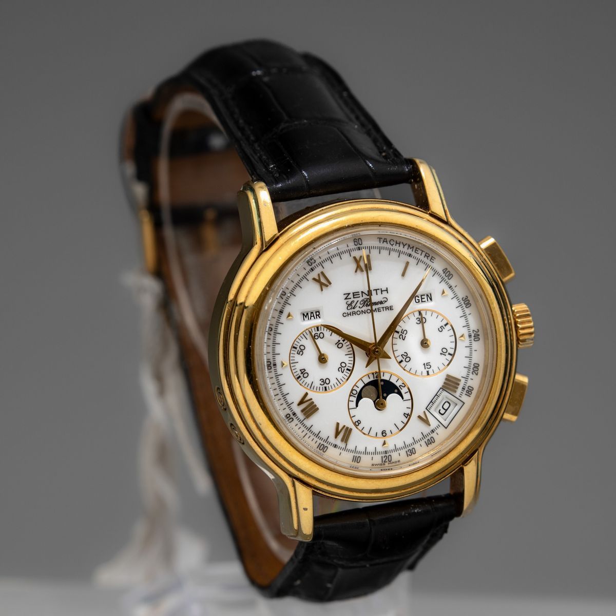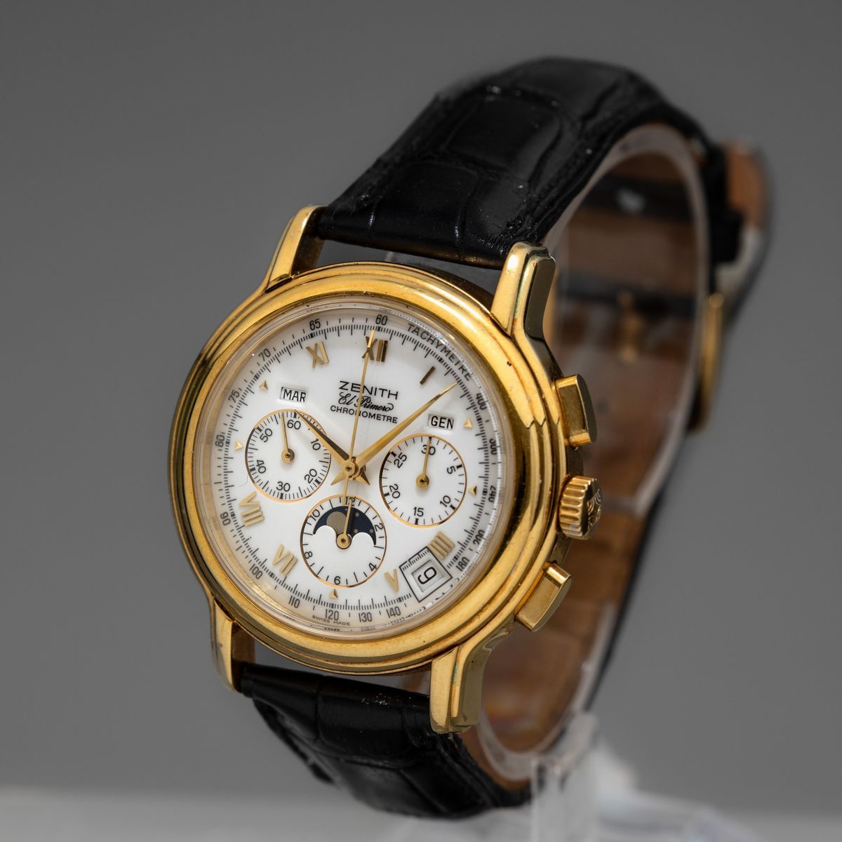 ZENITH - Chronomaster automatico in oro 18k, cronografo con calendario completo e fasi lunari, fondello a vista. Accompagnato da scatola e garanzia NOS