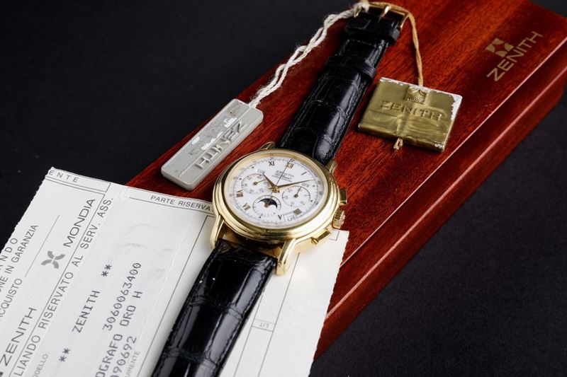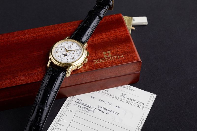 ZENITH - Chronomaster automatico in oro 18k, cronografo con calendario completo e fasi lunari, fondello a vista. Accompagnato [..]