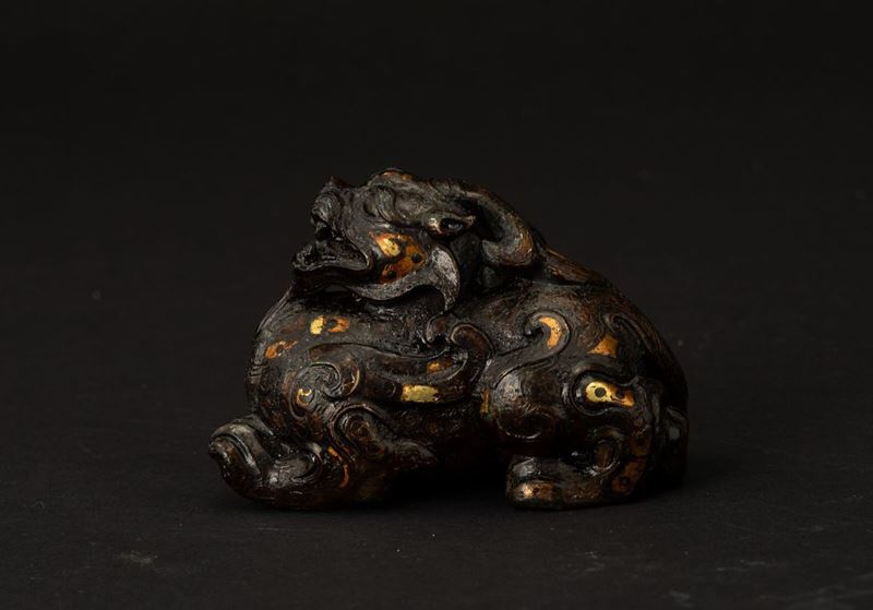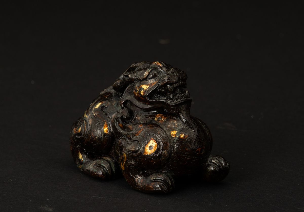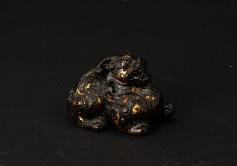 A bronze dragon, China, Ming Dynasty Gold-splashed decors.