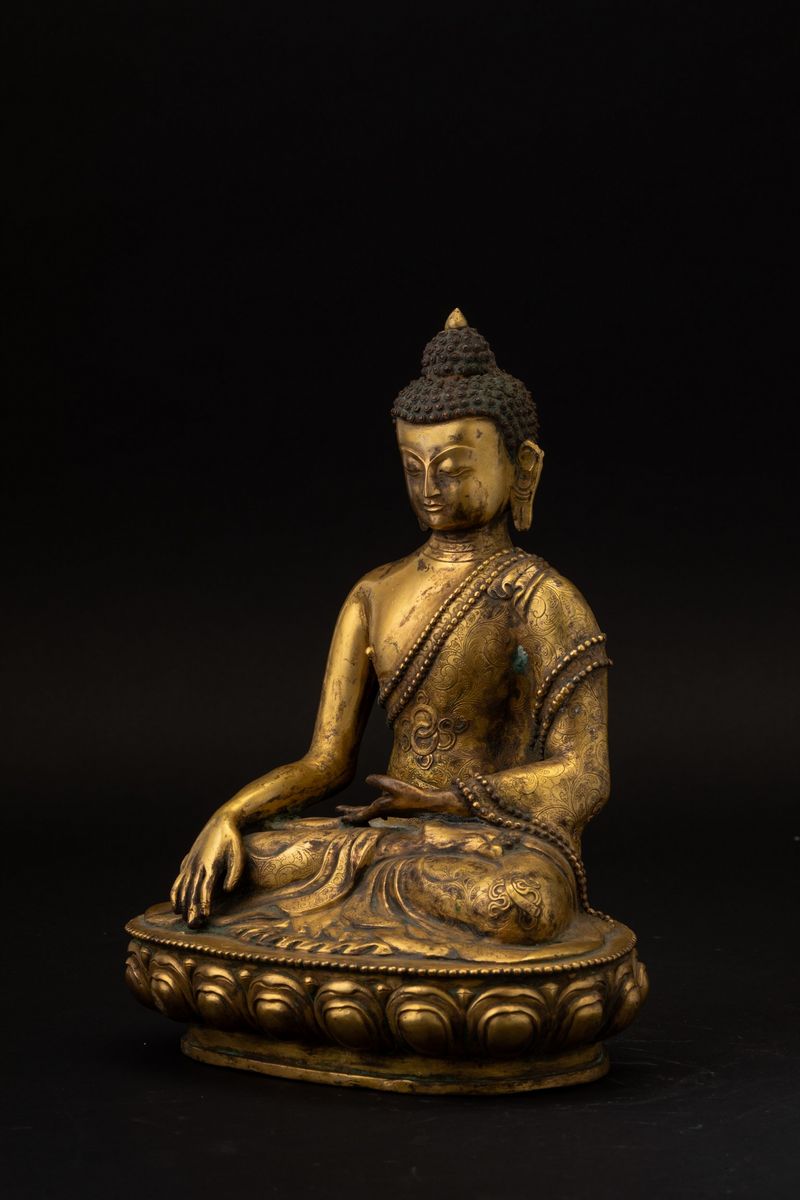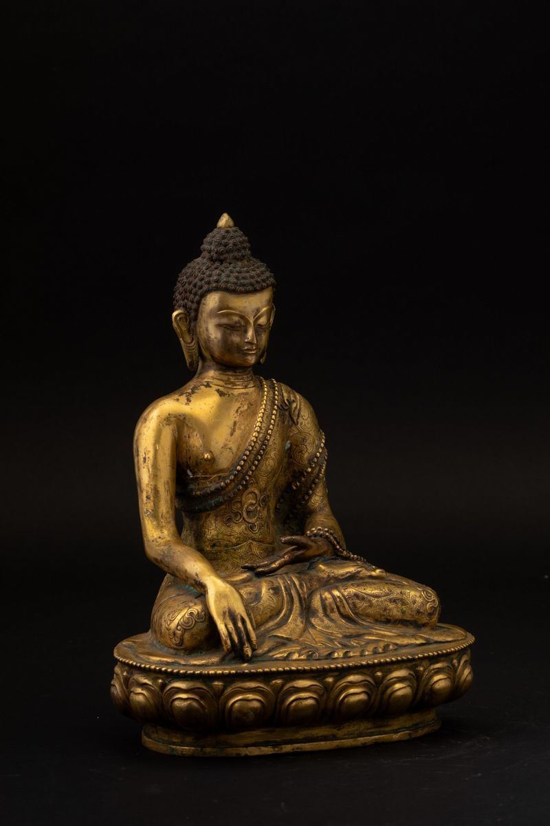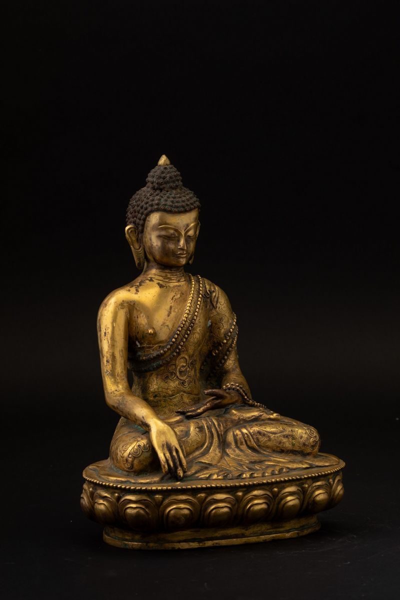 A gilt bronze Buddha Sakyamuni, China Ming Dynasty, 1500s. Traces of polychromy