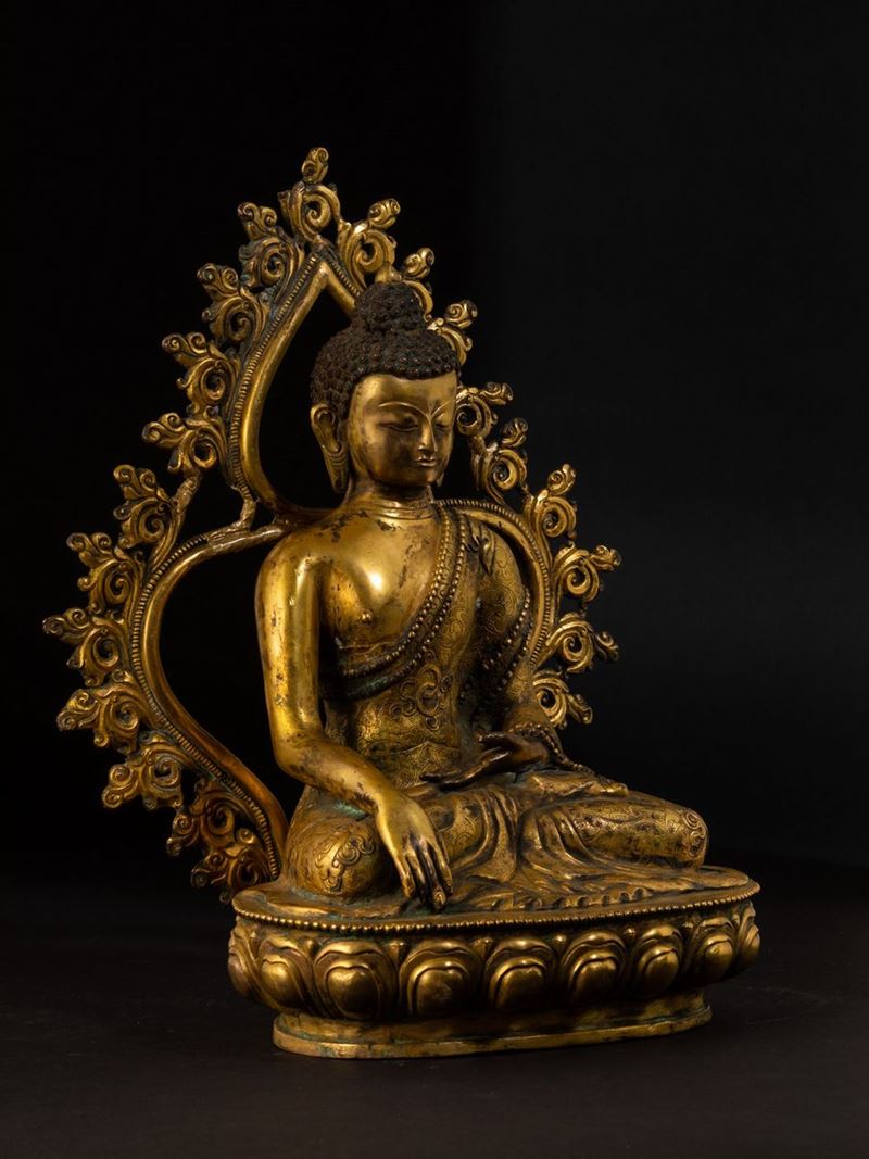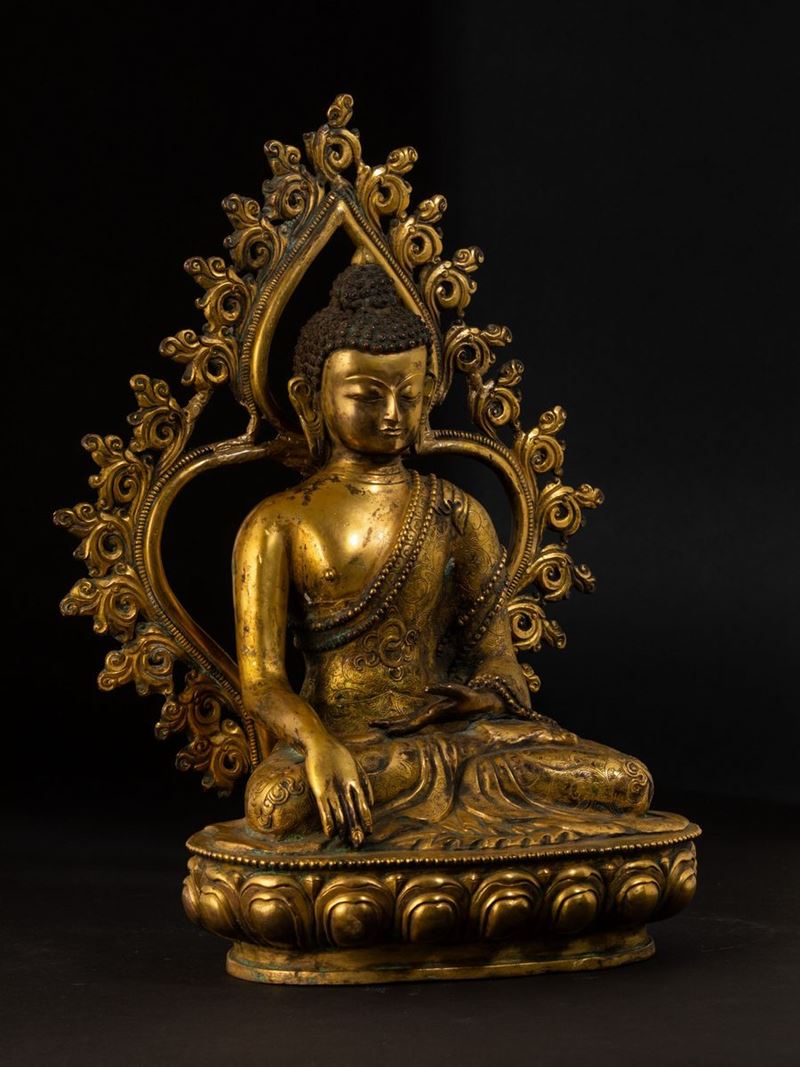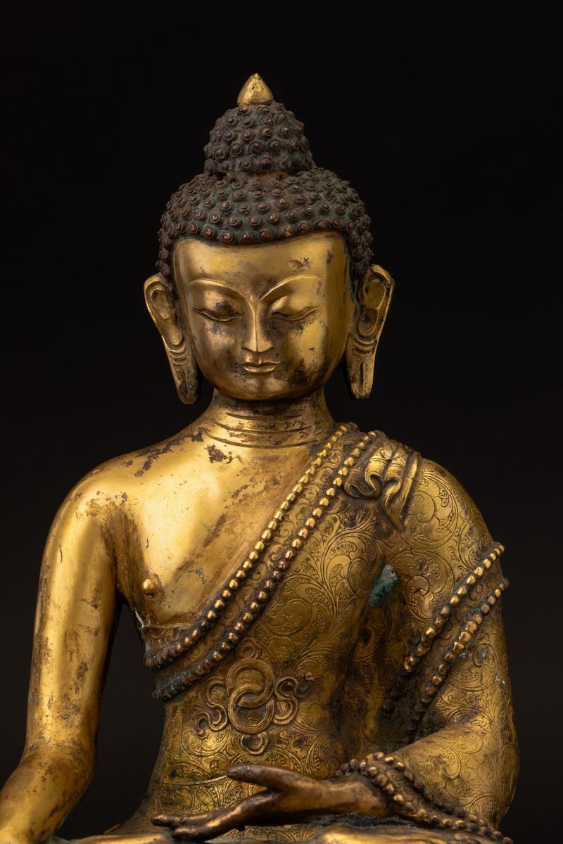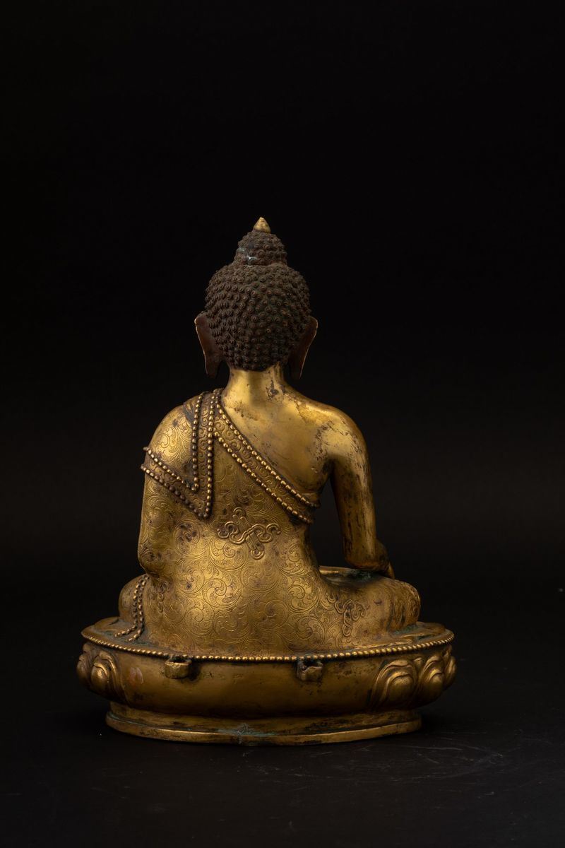 A gilt bronze Buddha Sakyamuni, China Ming Dynasty, 1500s. Traces of polychromy