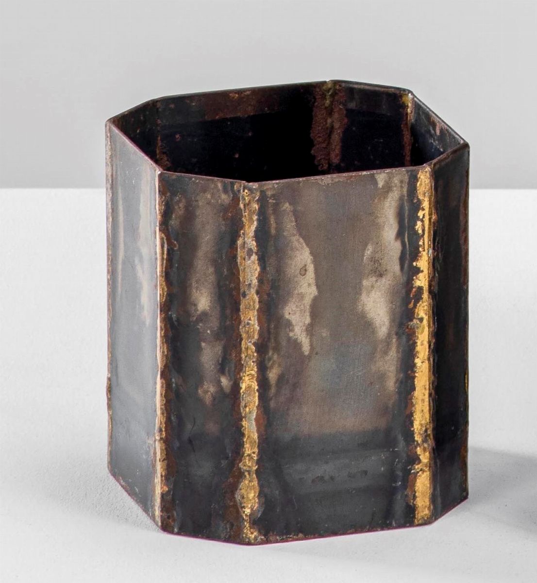 Iron sheet vase with visible unfinished welds.