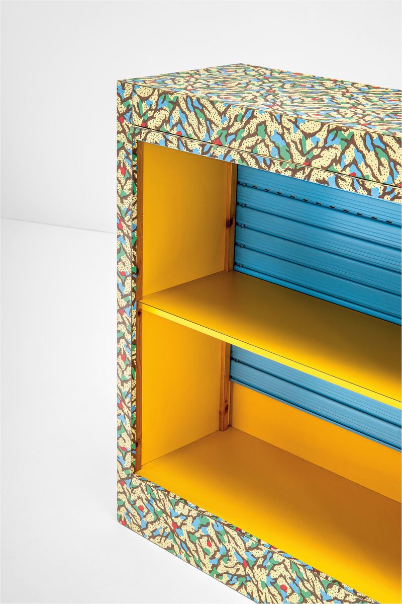 Rare cabinet mod. TIN 530 with rolling shutter closure. Wooden structure with plastic laminate covering. Alchimia, Italy, 1980 ca.