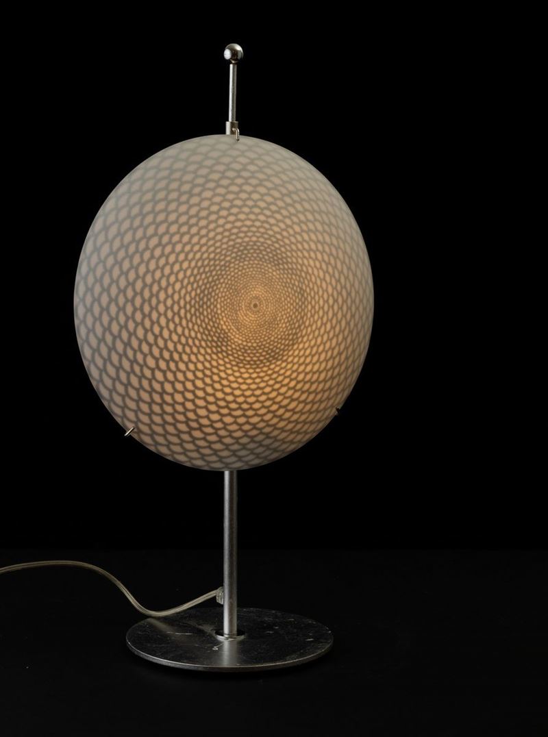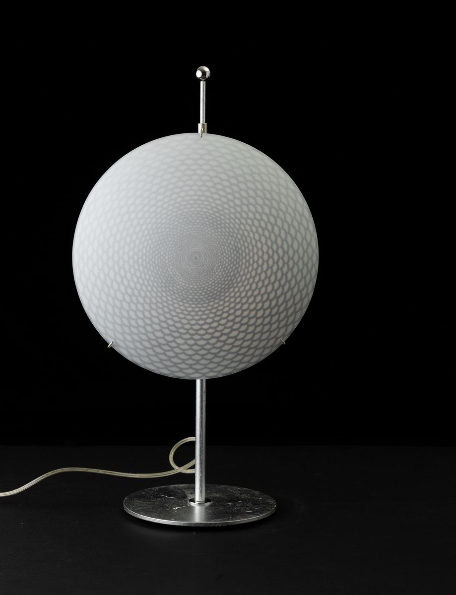 Table lamp with iron and silver leaf base and screen printed glass diffuser Optical decoration.