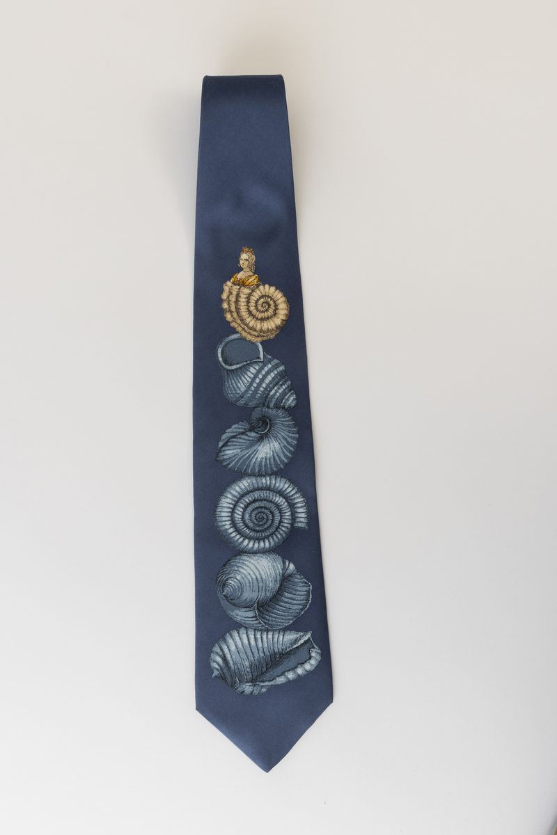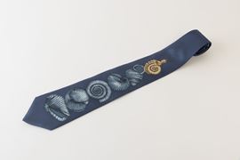 Blue silk tie with decor of fossils.