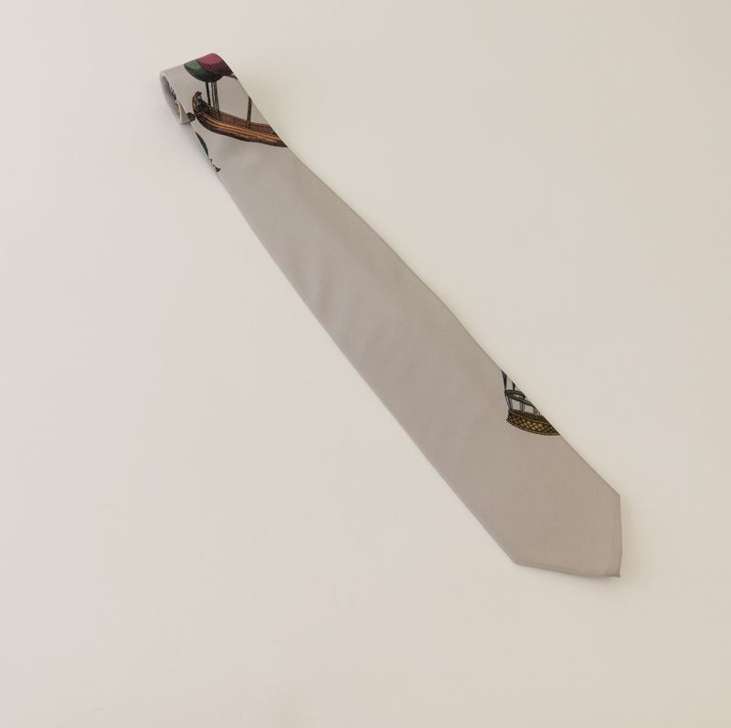 Grey silk tie with decor of hot air balloons.