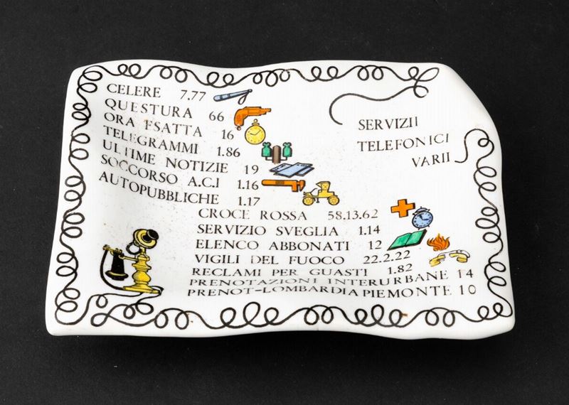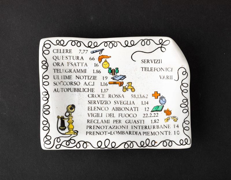 Ashtray Servizi Telefonici Vari in screen printed and hand-painted porcelain.