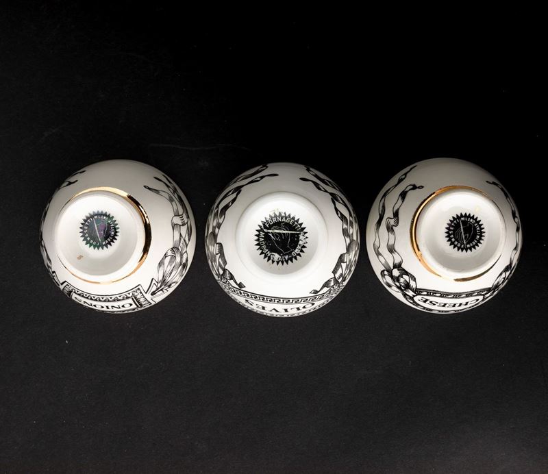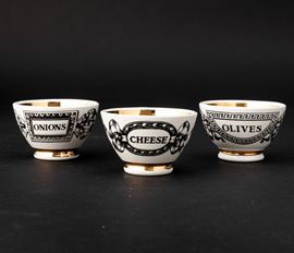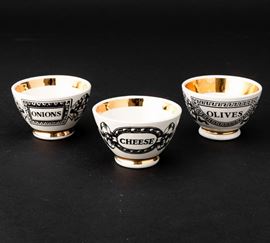 Lot of three appetizer bowls in screen-printed and hand-painted earthenware with gold bands.