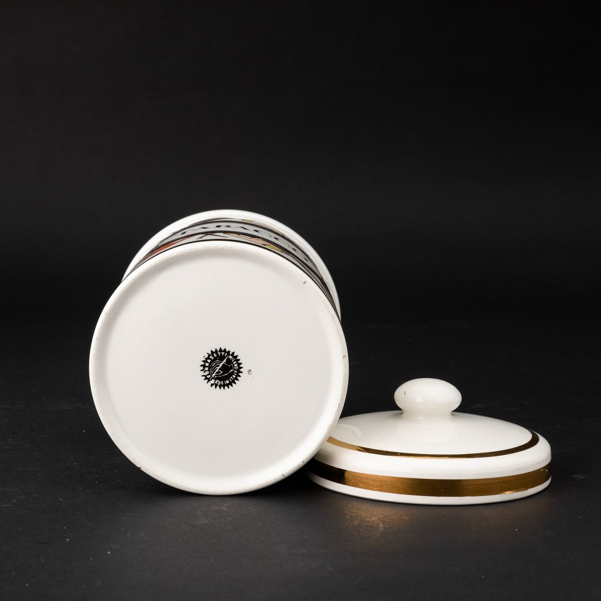Vase with lid in screen-printed and hand-painted earthenware with gold bands.