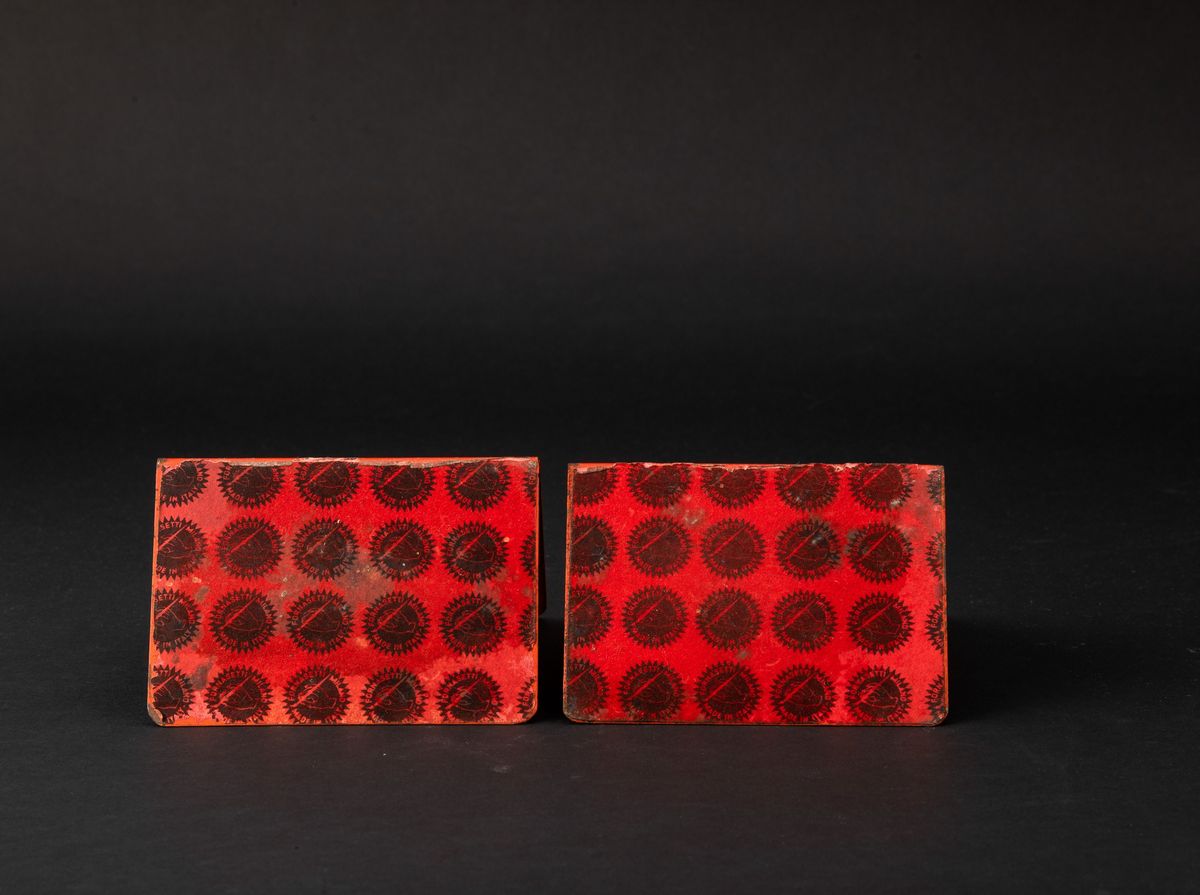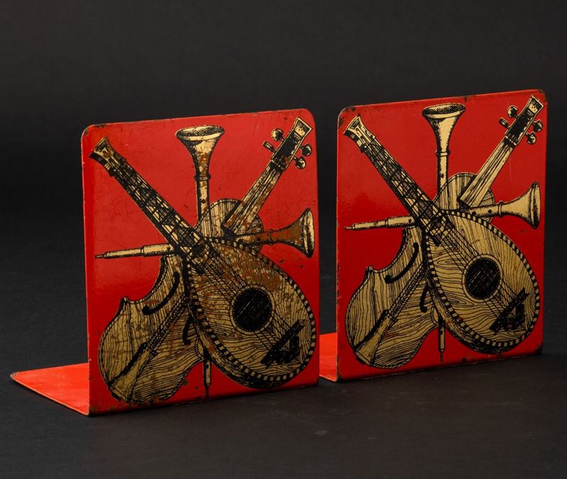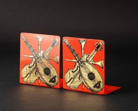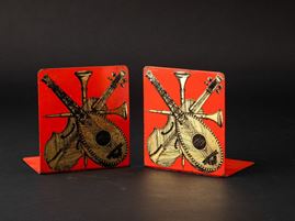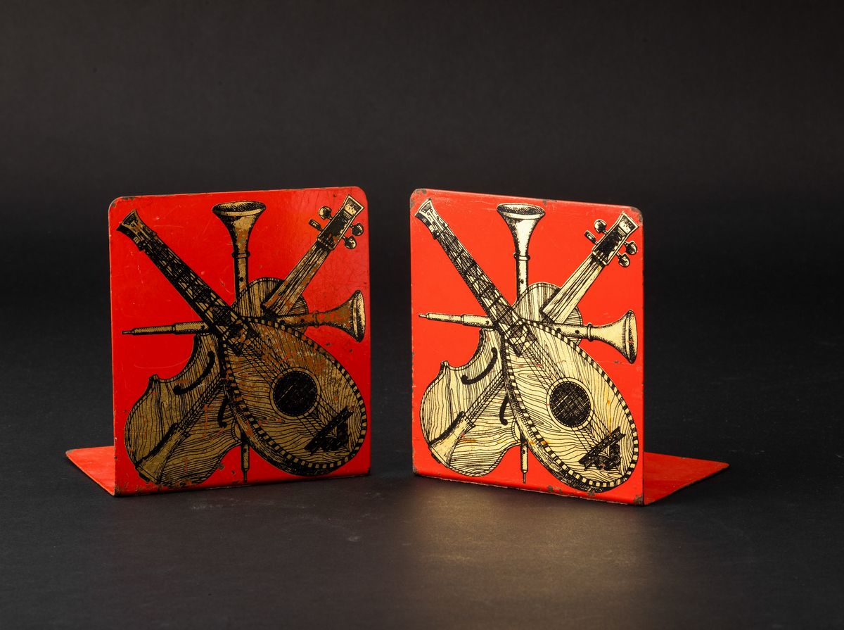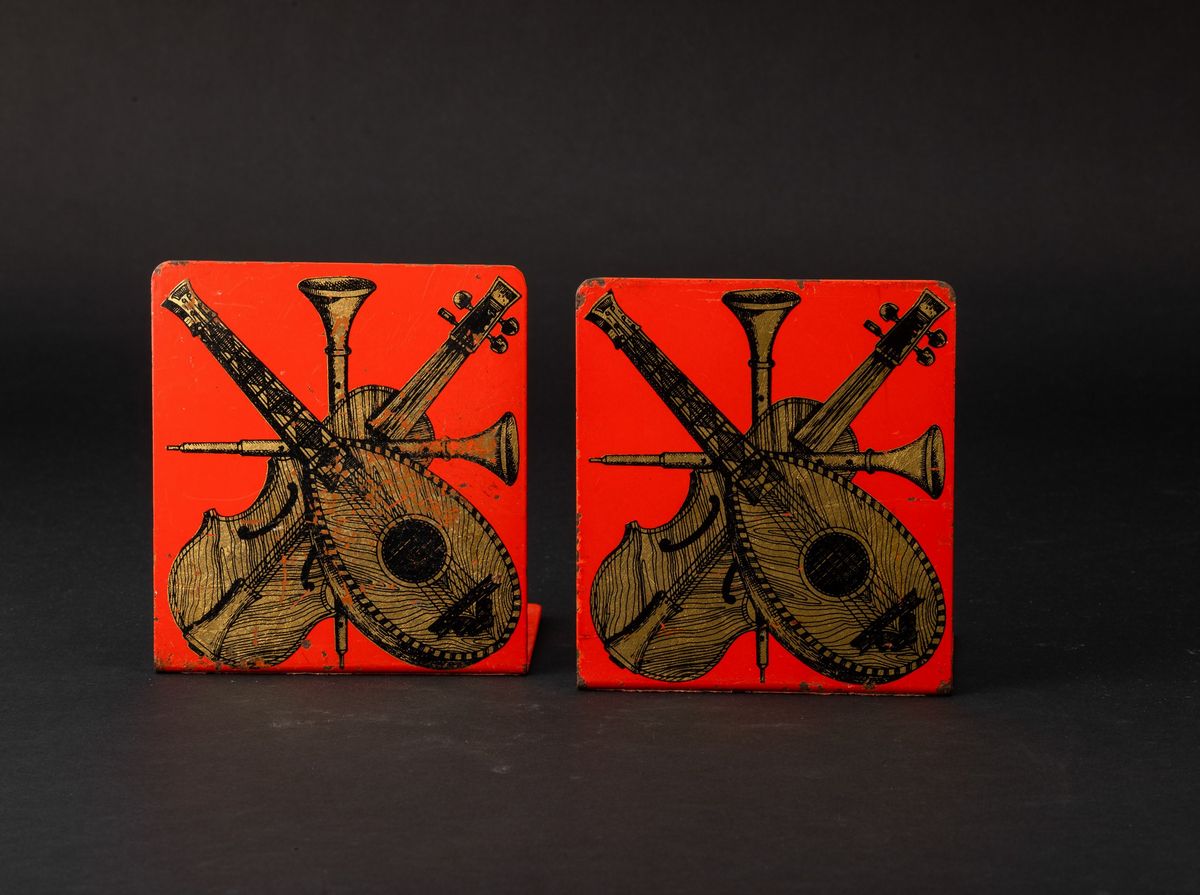 Lot of a pair of bookends in screen printed metal with gold music instruments decoration on red.