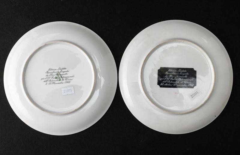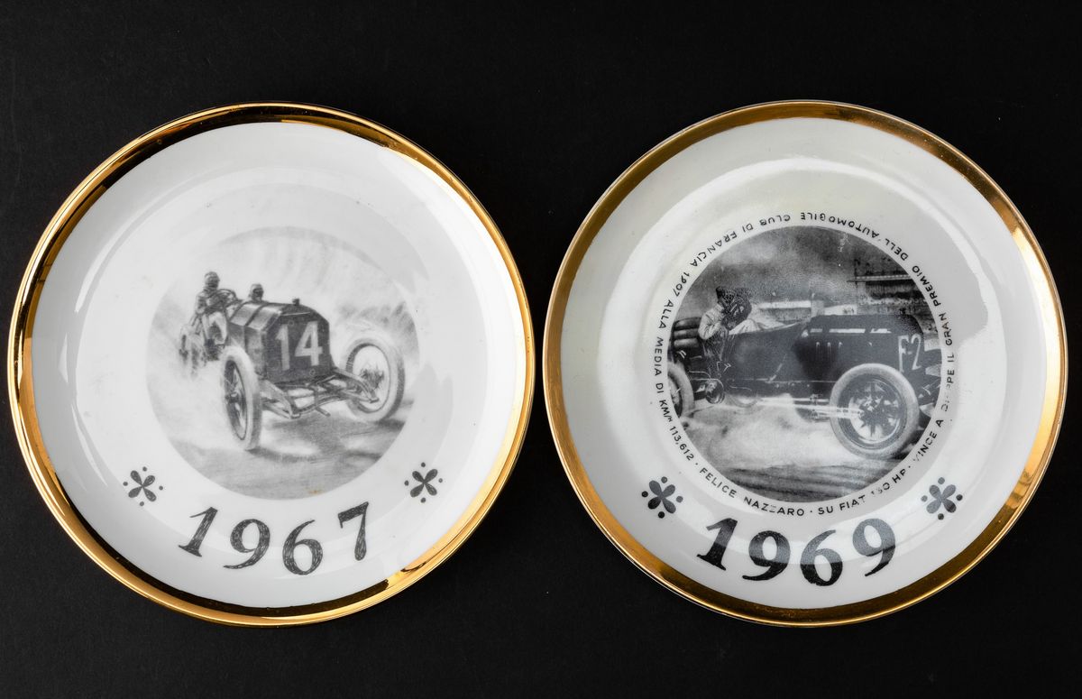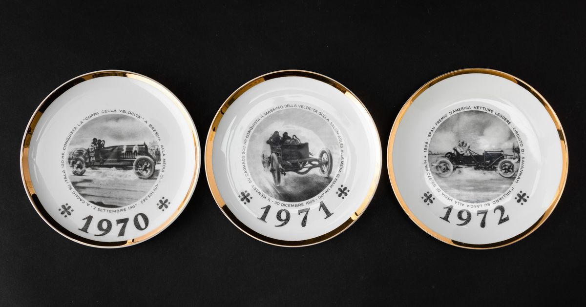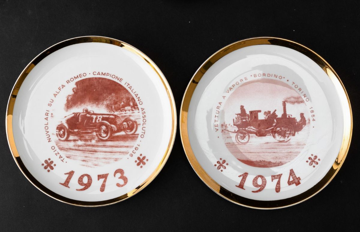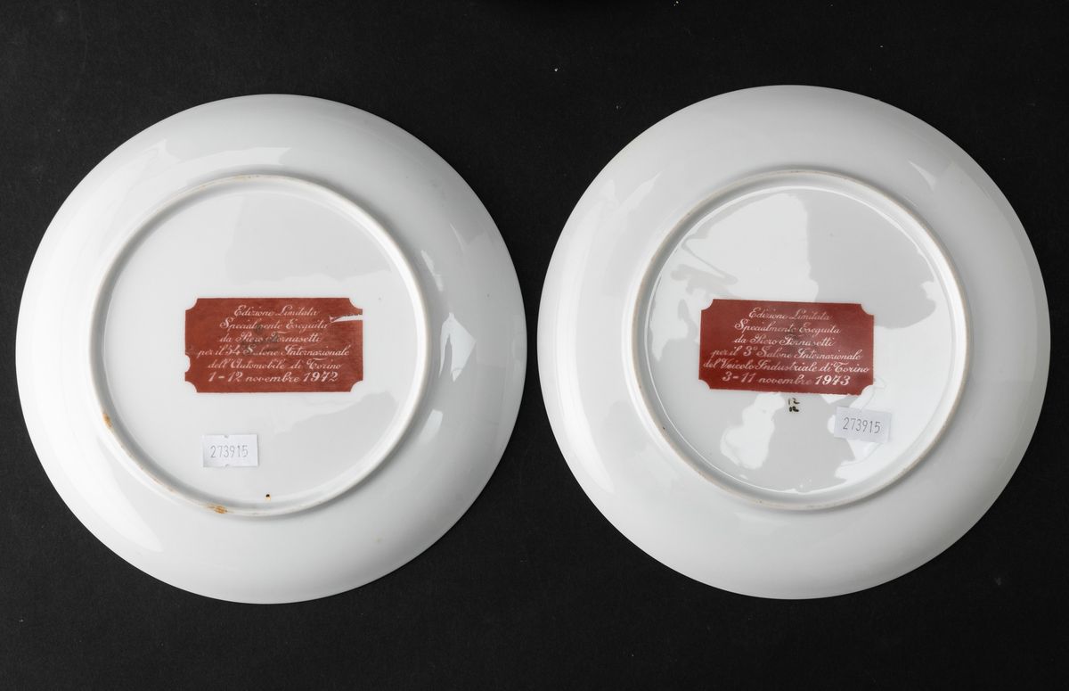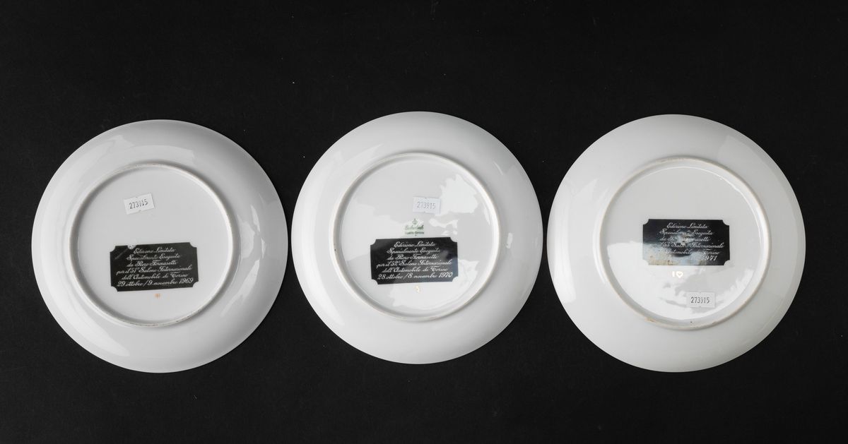 Lot of seven plates in screen printed porcelain and gilded edge. Series realized for Turin International Automobile Salon.