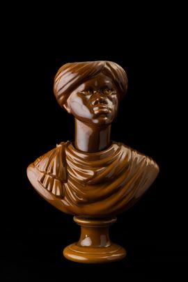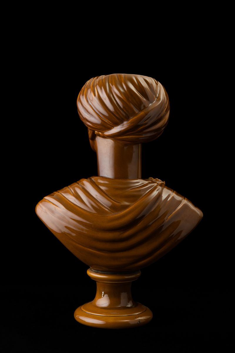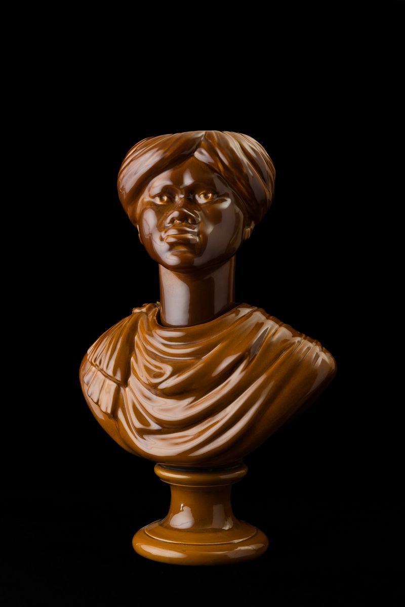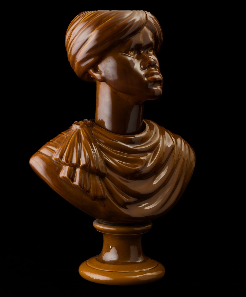 Bust of Moor on turned ceramic plinth with tobacco glaze decoration.