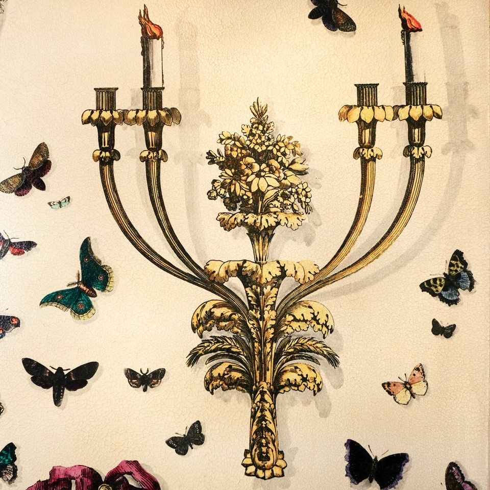 Lot of a pair of lacquered wooden doors with lithographic and hand-painted decoration with polychrome enamels of butterflies, brass sconces, and framed squares. Brass knobs.