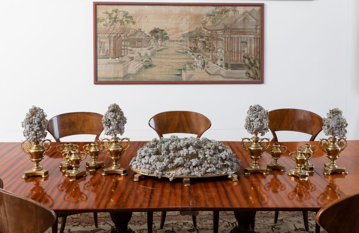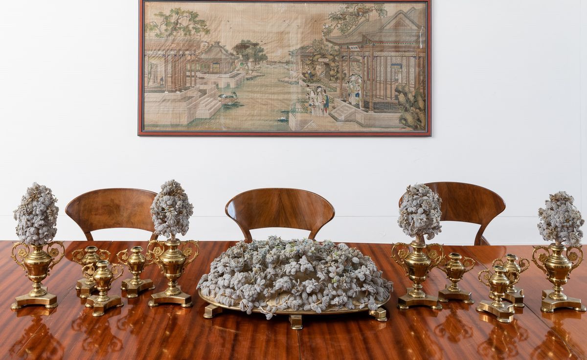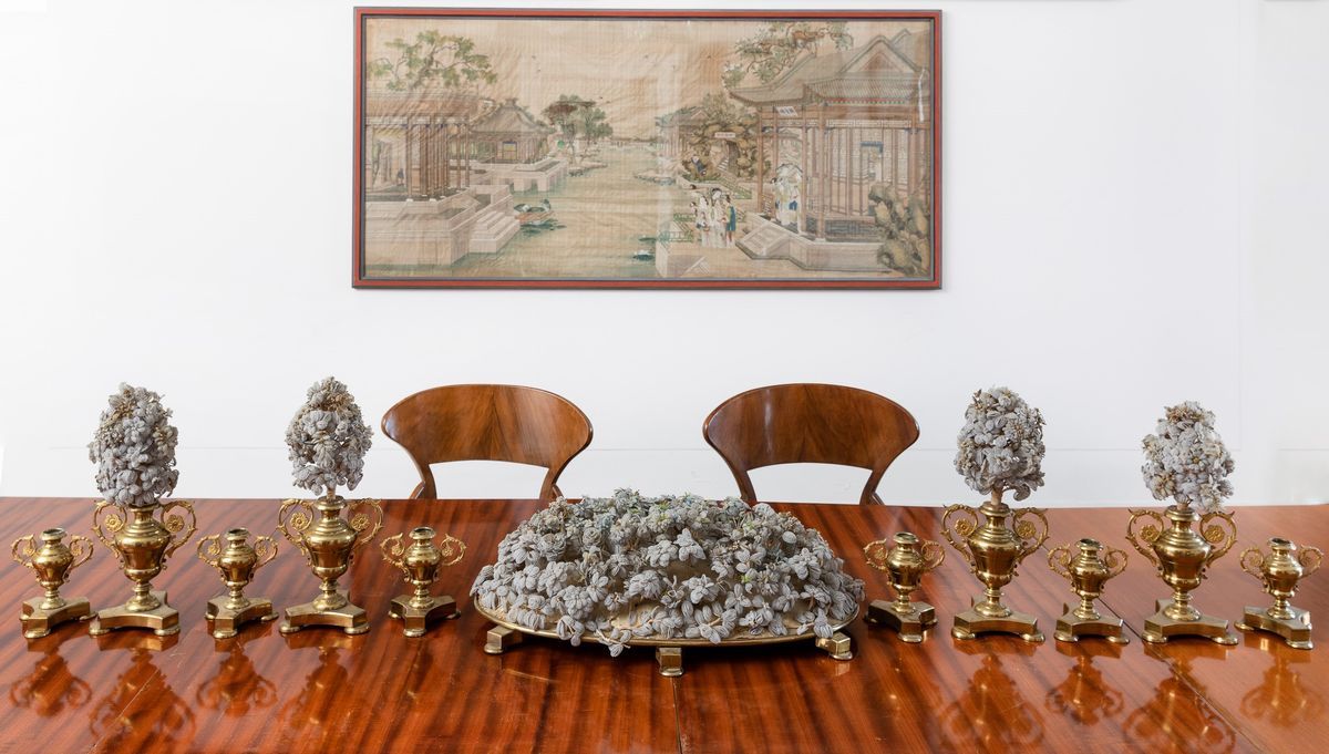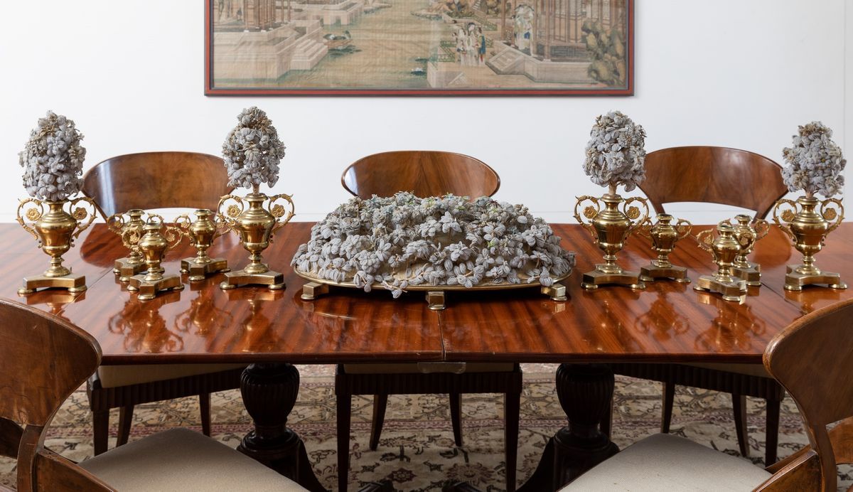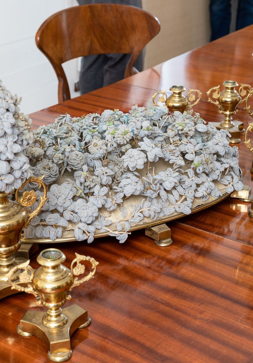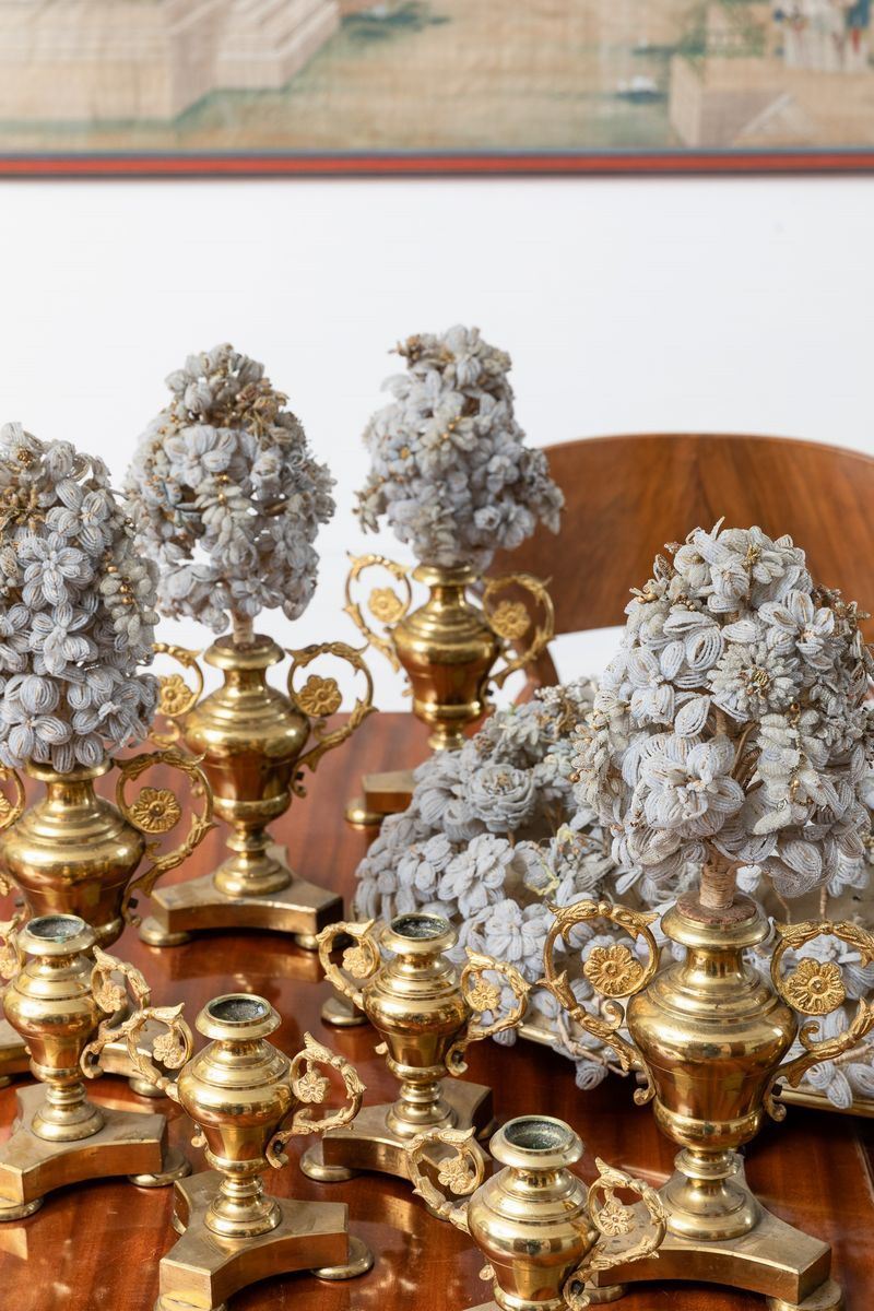 Made up of 11 items: a tray with a Murano glass bead decor, four bouquet holders and six candle holders
