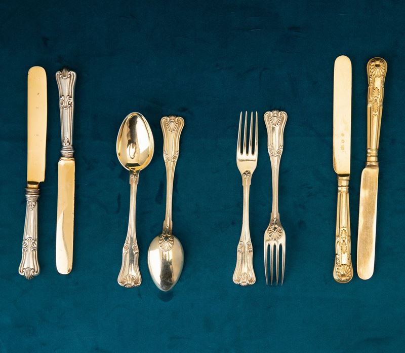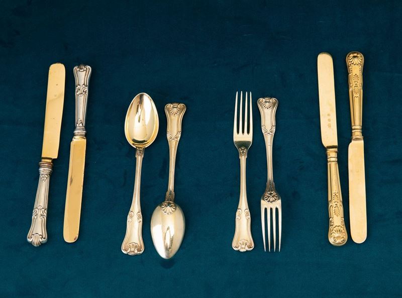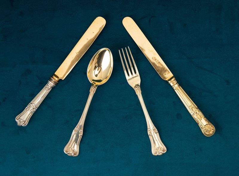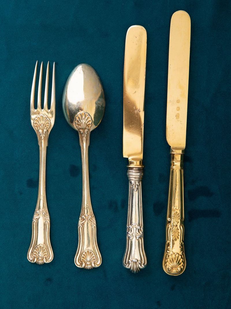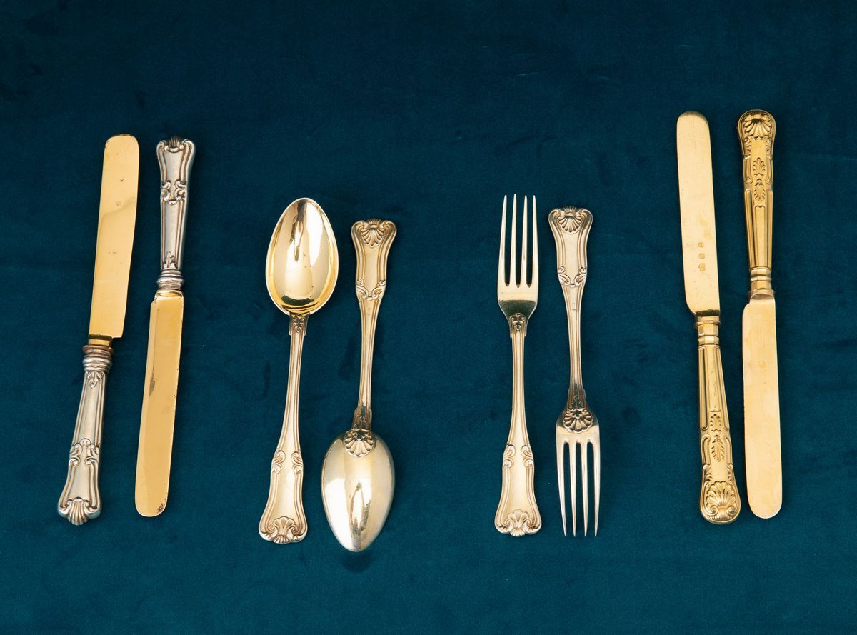 35 forks and 36 spoons. Combined with 24 gilt metal knives and 12 smaller silver knives. Marked with the Mauritius cross