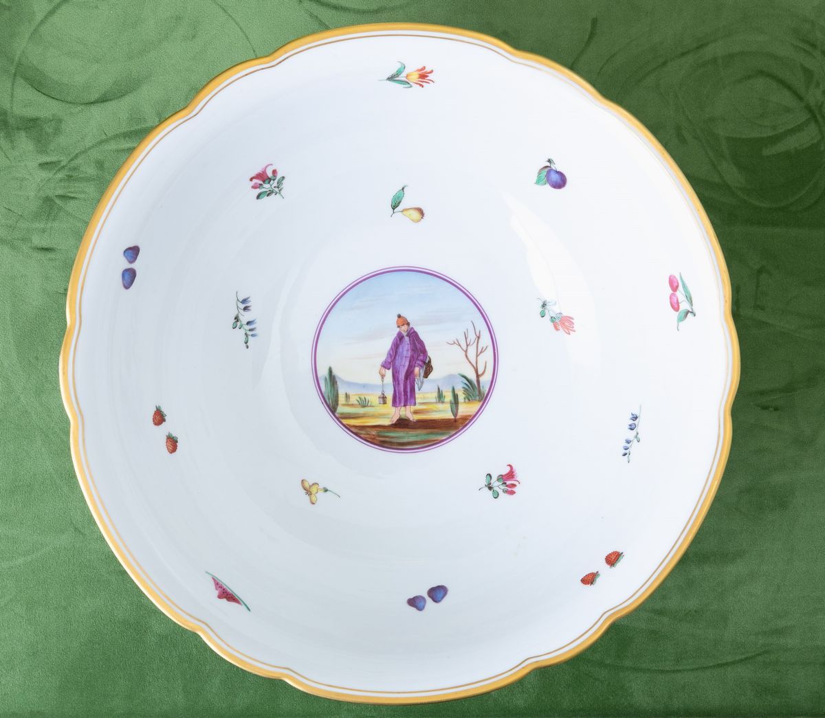 Polychrome decor. Made up of 24 soup plates, 48 plates, 23 half-moons, 48 dessert plates, 17 trays, 5 gravy boats, a soup tureen, 2 salad bowls, a bowl, a round serving dish, other spare plates.