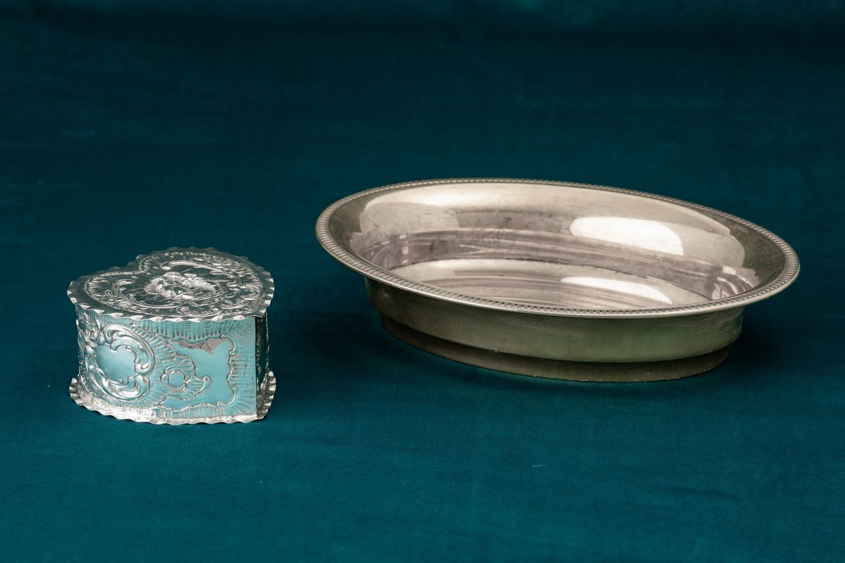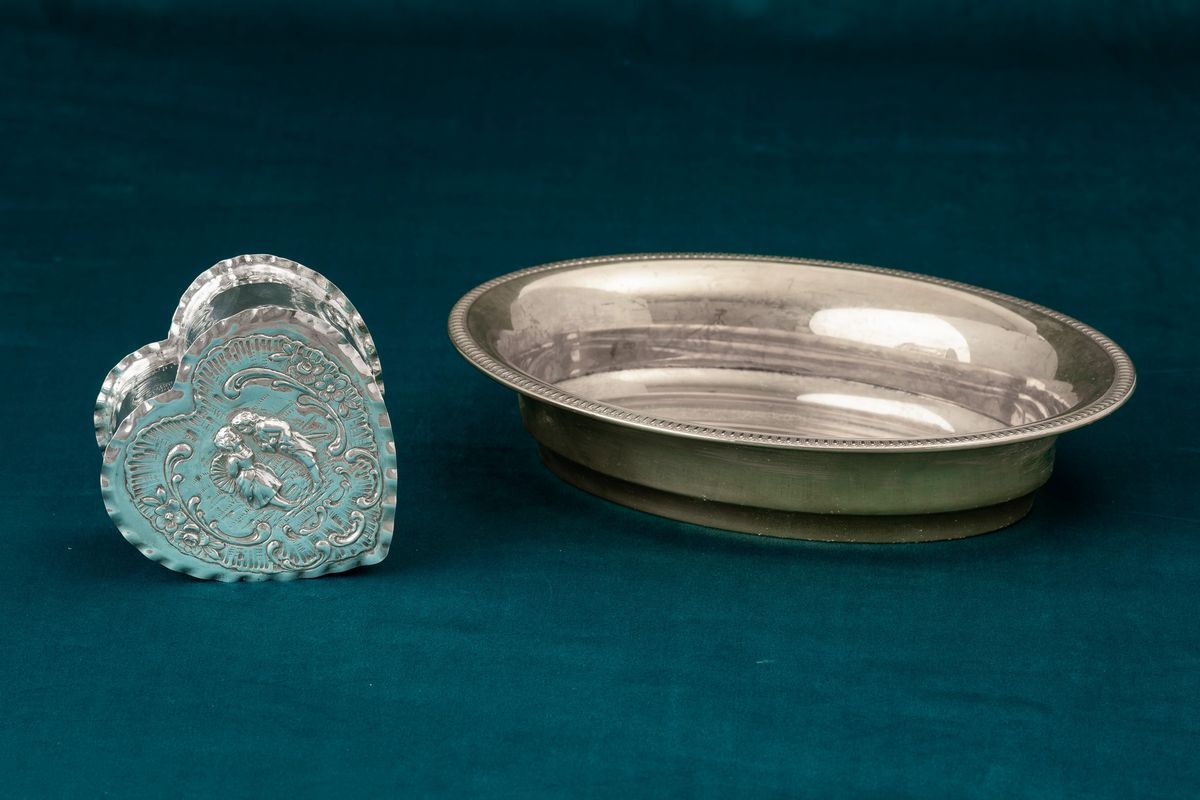 An embossed silver heart-shaped box and an oval vermeil bowl