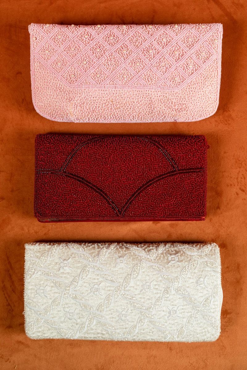 Embroidered and beaded. Together with a red silk beaded pocketbook and a pink silk pocketbook with beads and pearls.