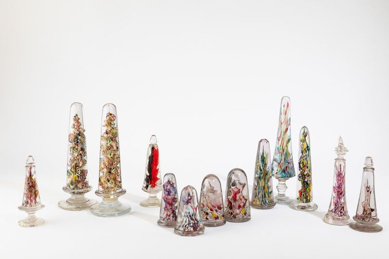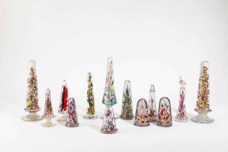 A collection of 13 blown glass obelisks with a decor of polychrome powders. Broken parts