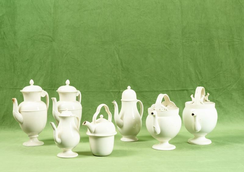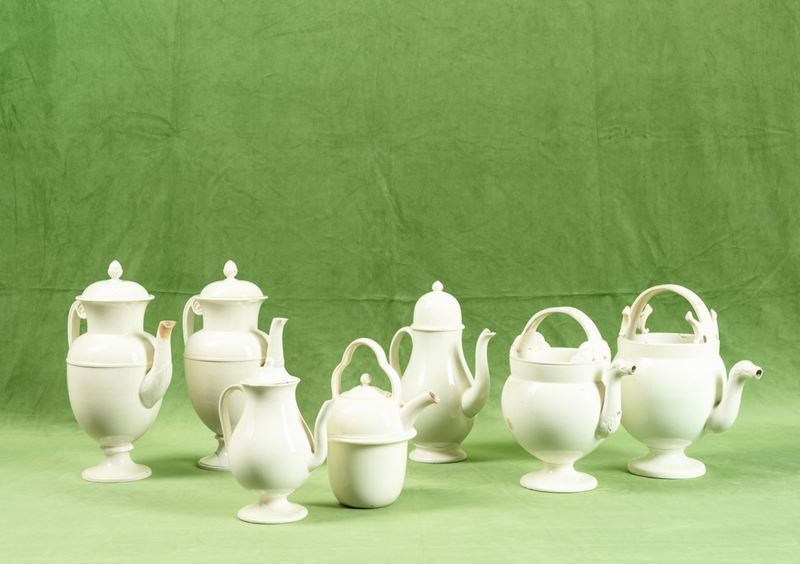 A set of earthenware coffee pots and pitchers. Broken parts