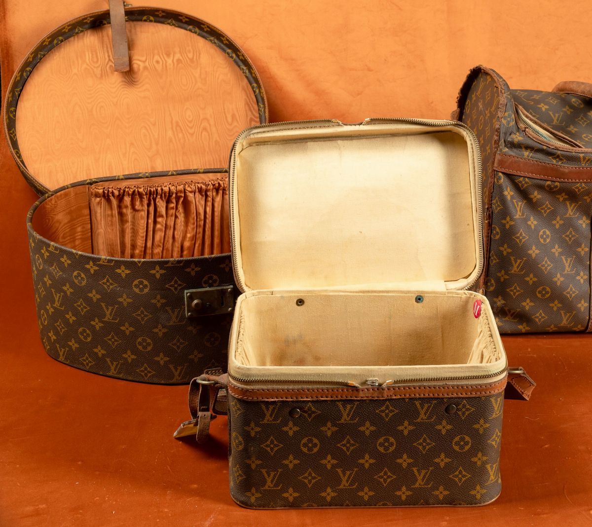 A beauty case, a hatbox and a large satchel bag.