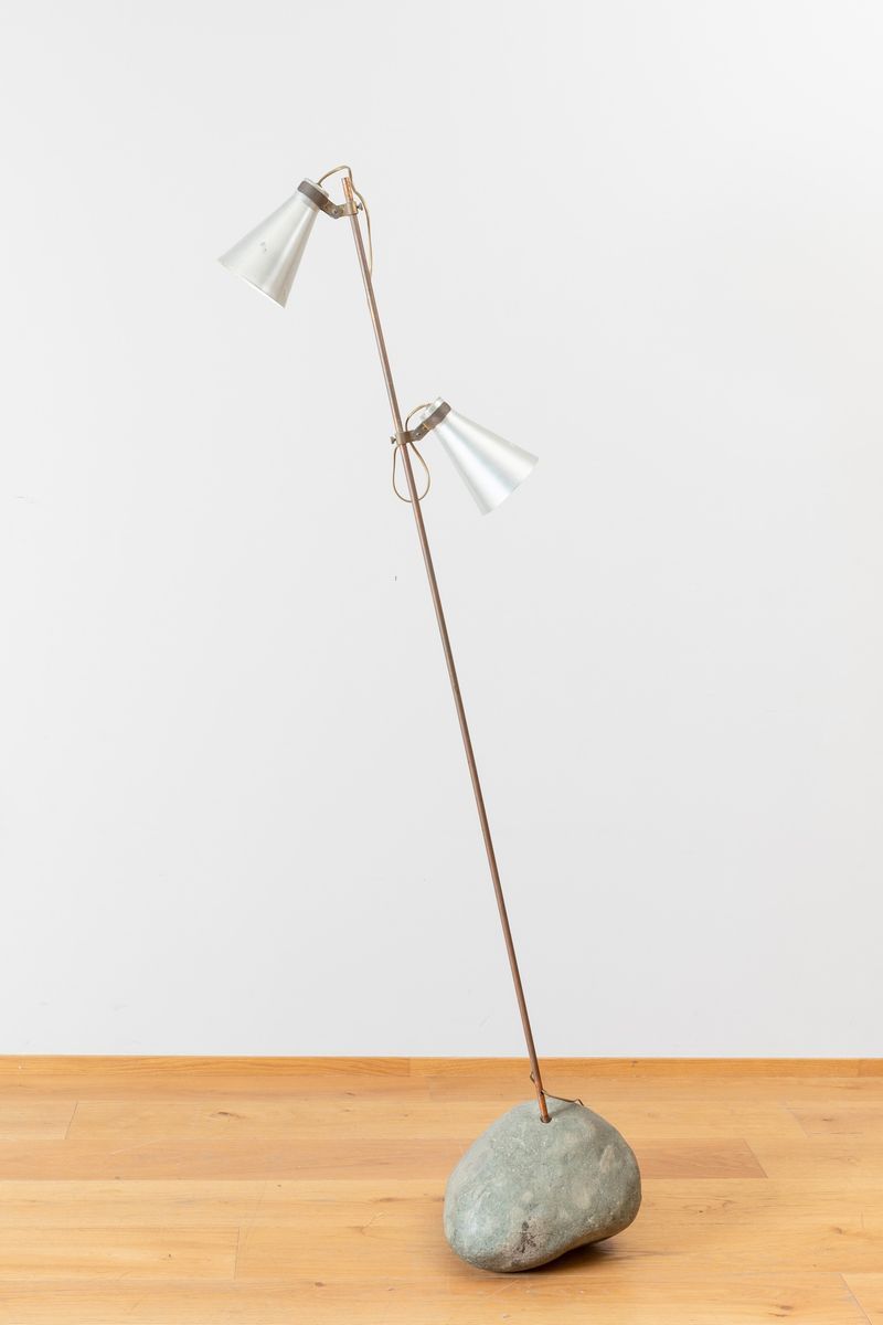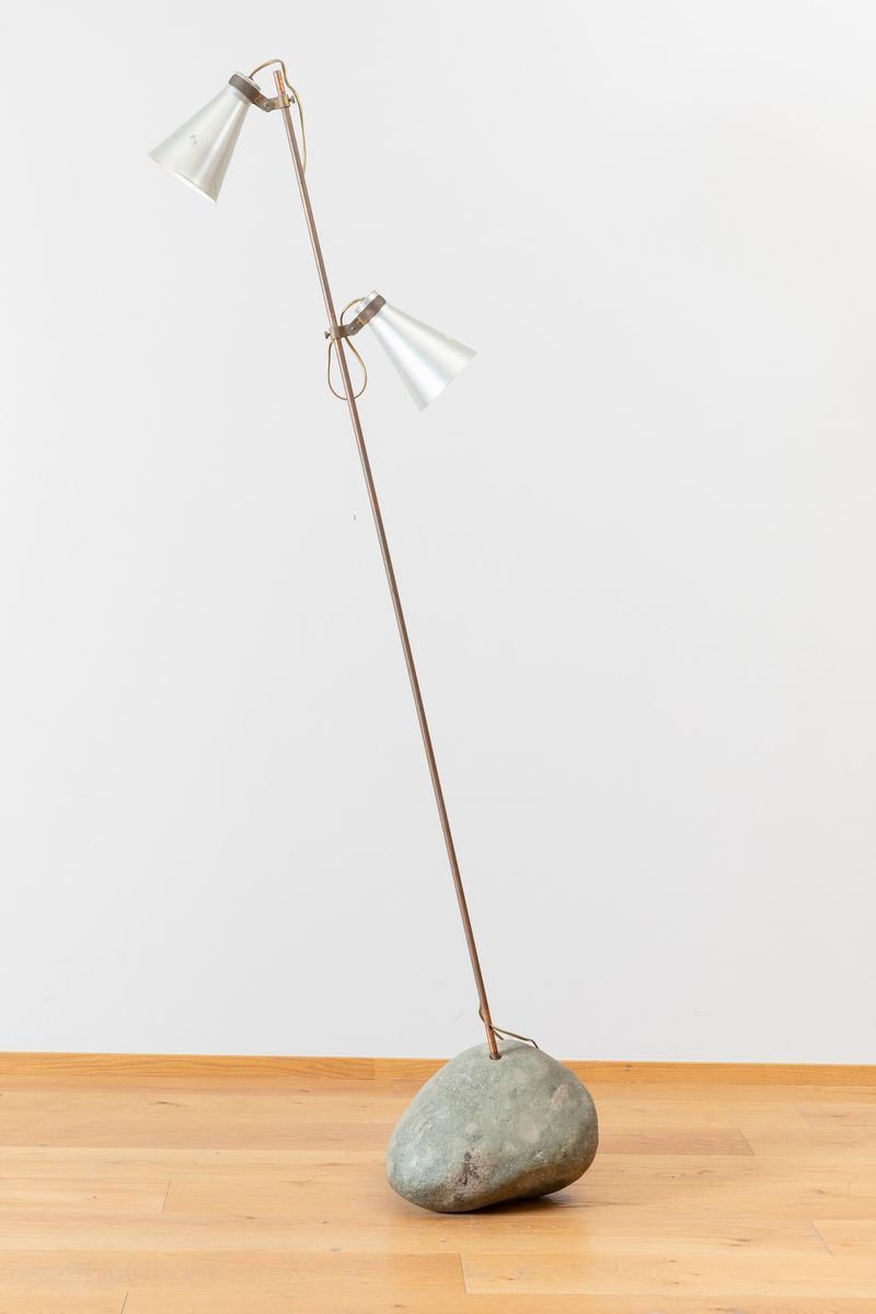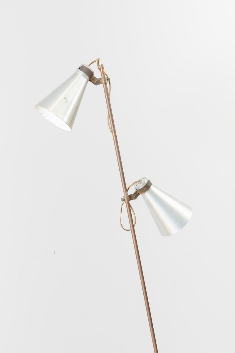 A rare Sasso brass floor lamp with two enameled aluminium shades, steel stem and stone base