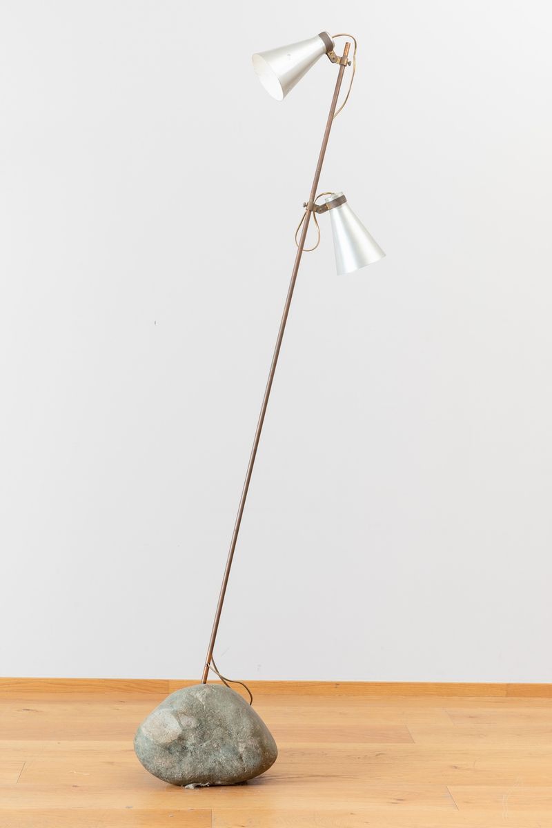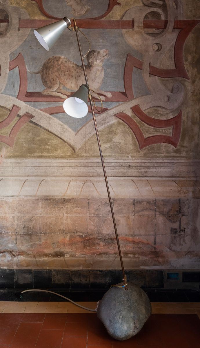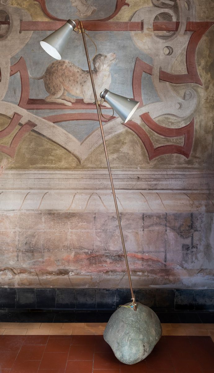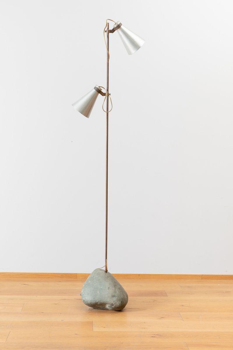 A rare Sasso brass floor lamp with two enameled aluminium shades, steel stem and stone base