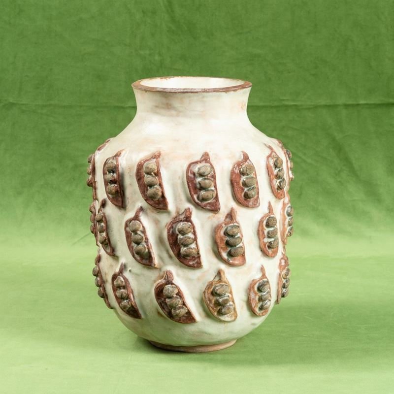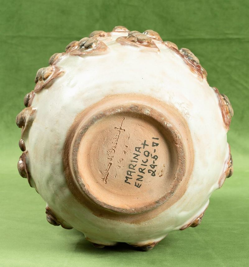 A majolica tiled vase with a high-relief decor. Engraved mark and dedication with date