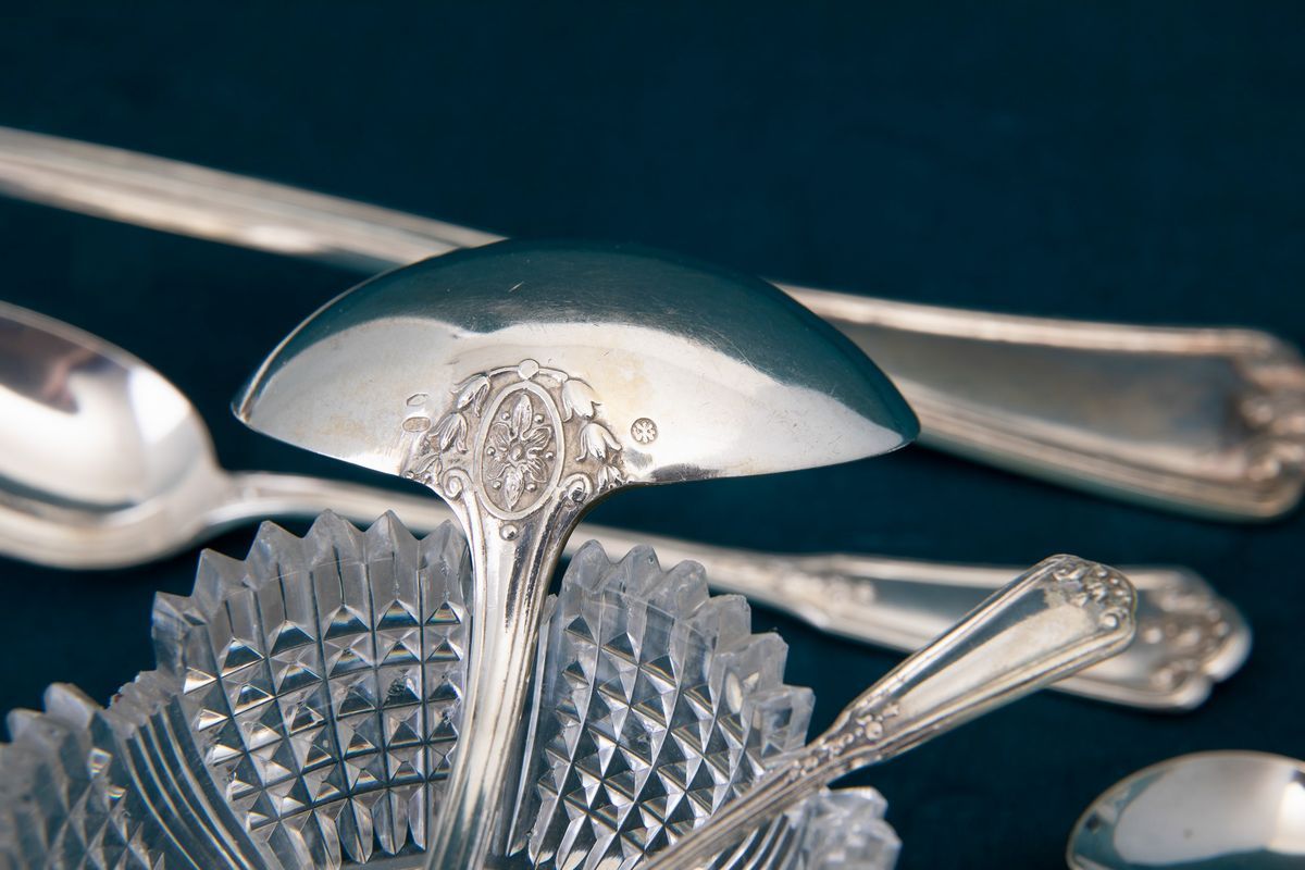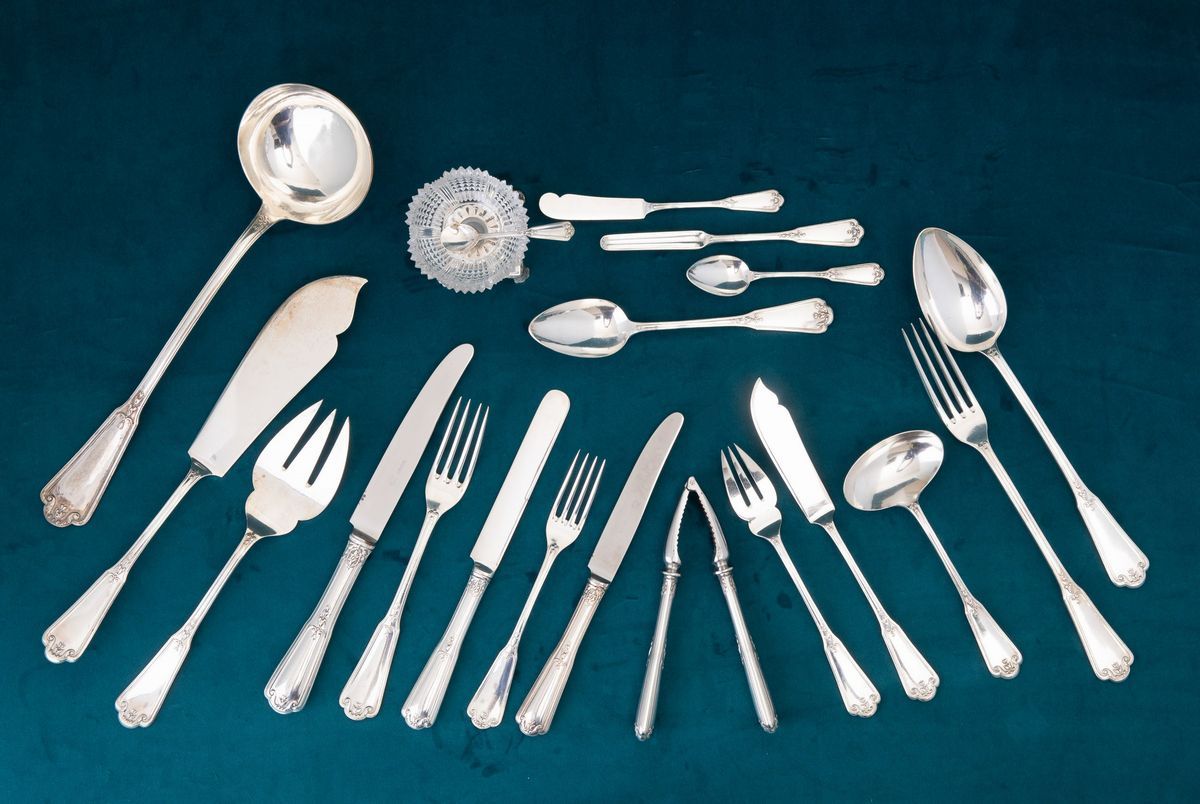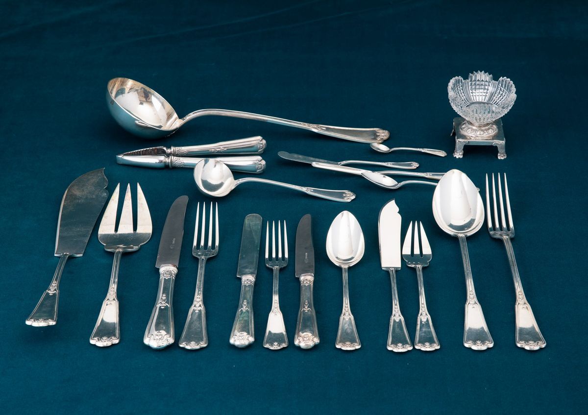 12 spoons, 12 smaller spoons, 24 dessert forks, 36 forks, 12 knives, 4 sauce spoons, 12 knives, 12 butter knives, 12 ossobuco knives, 12 fish knives, 12 fish forks, 2 nutcrackers, 26 knives, 4 fourchettes, 4 serving spoons, a spatula, a ladle, a large fish fork, 24 teaspoons, 8 salt shakers in silver and ground crystal.