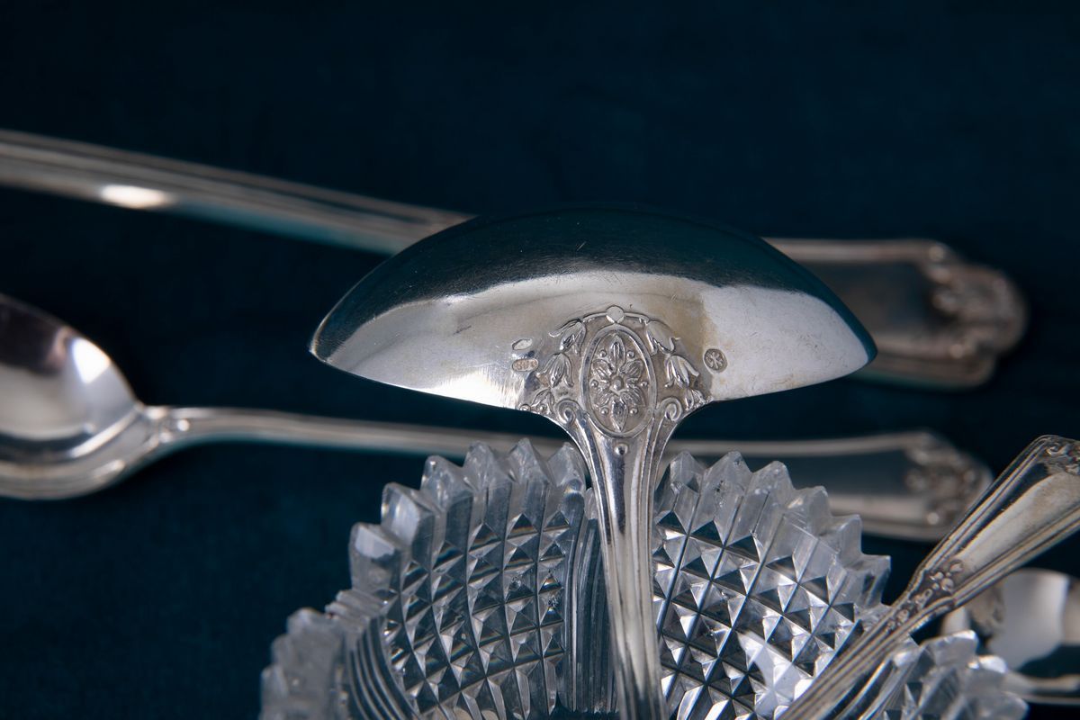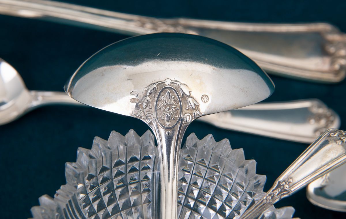 Silver cutlery by Henin, Milan. Silver and crystal salt shakers from Genoa, 1800s.