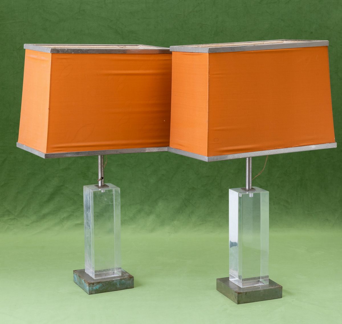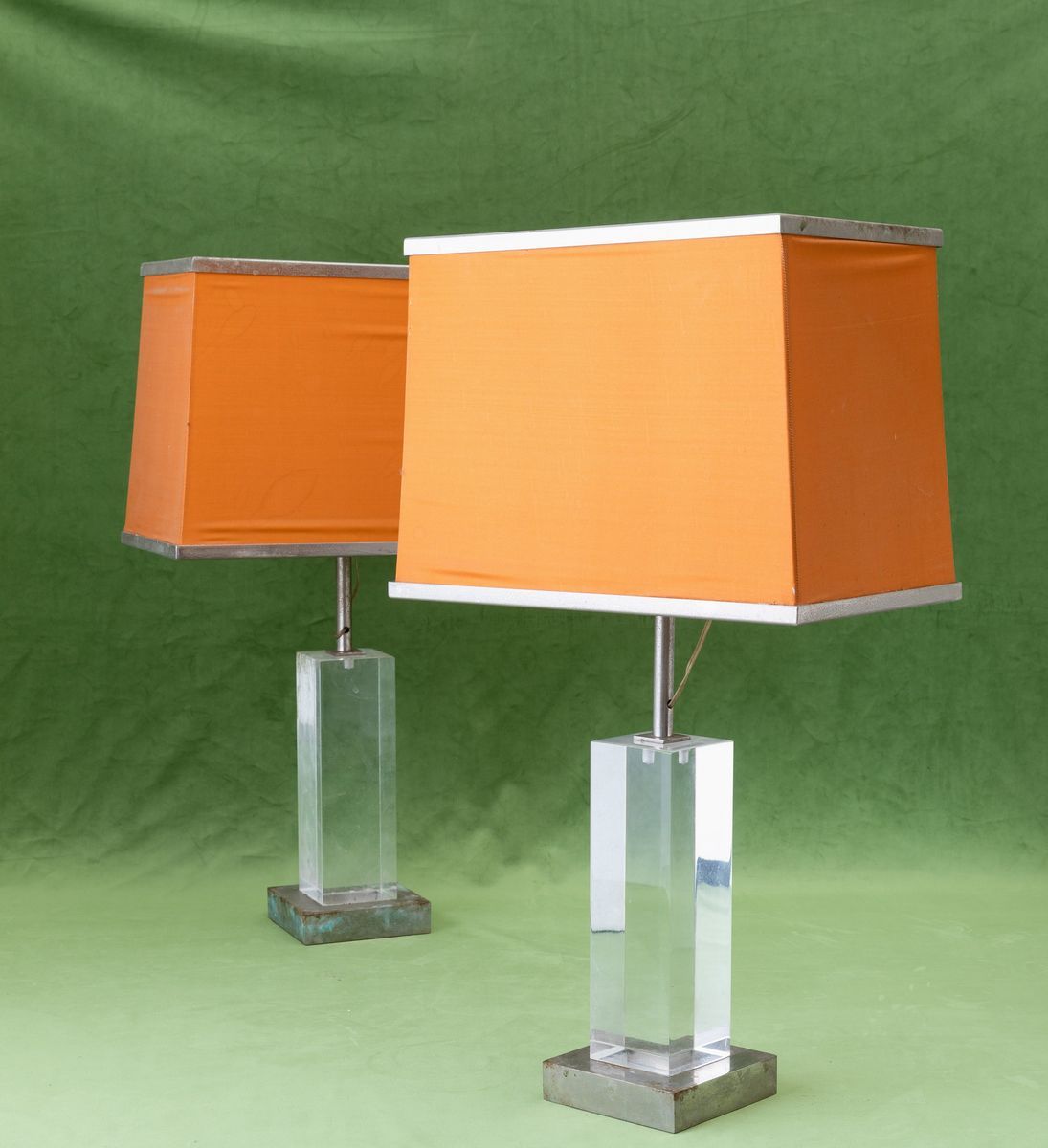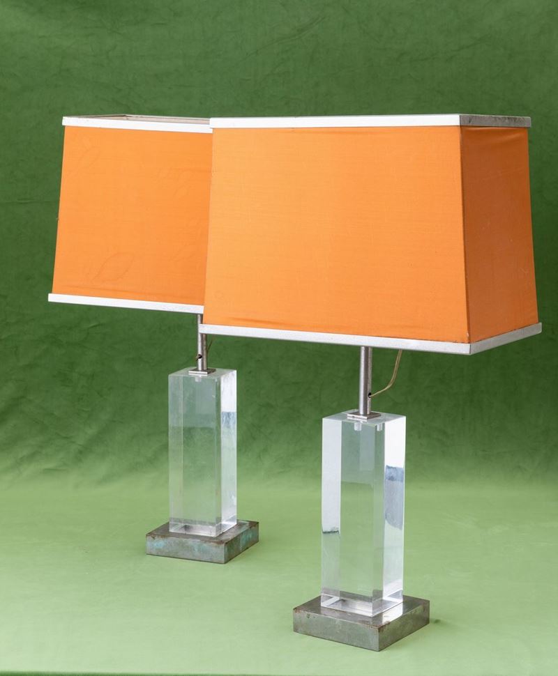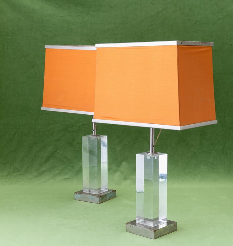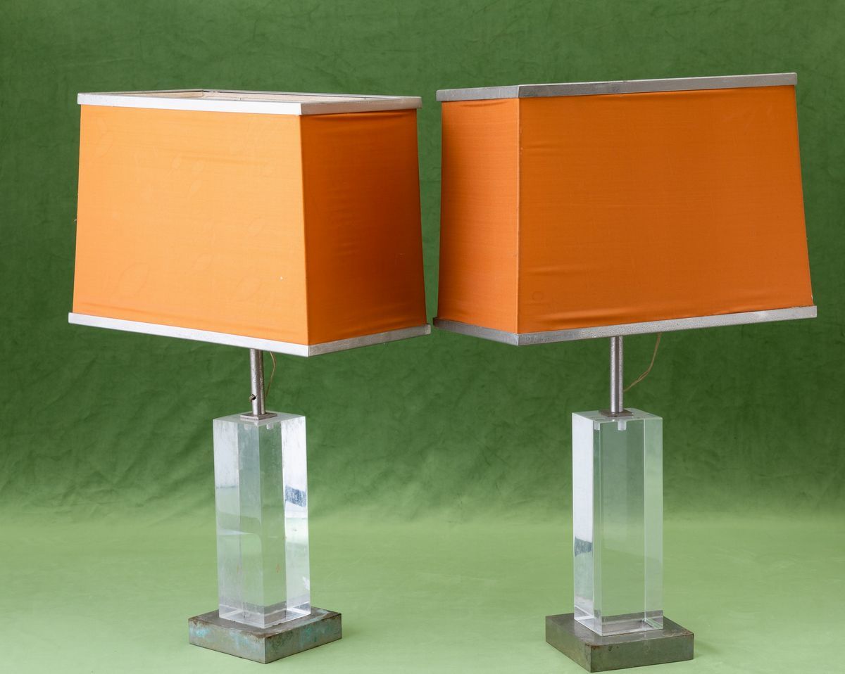 Two chromed brass and plexiglas lamps. Old paper label. With defects