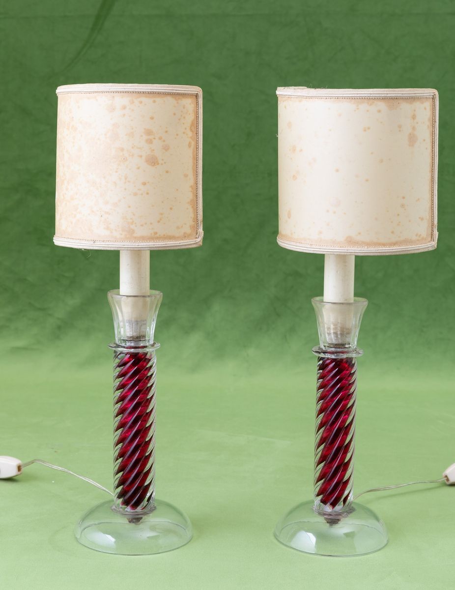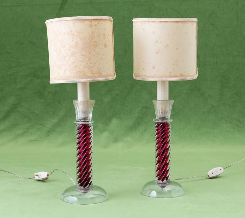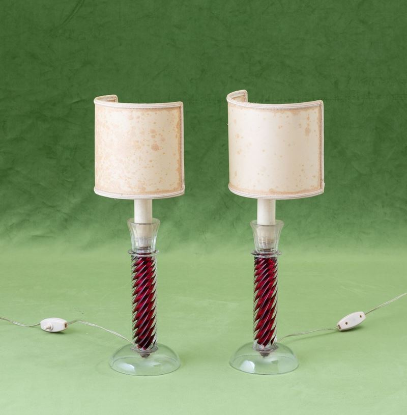 Two sommerso glass candle holders, mounted as lamps. Engraved signature