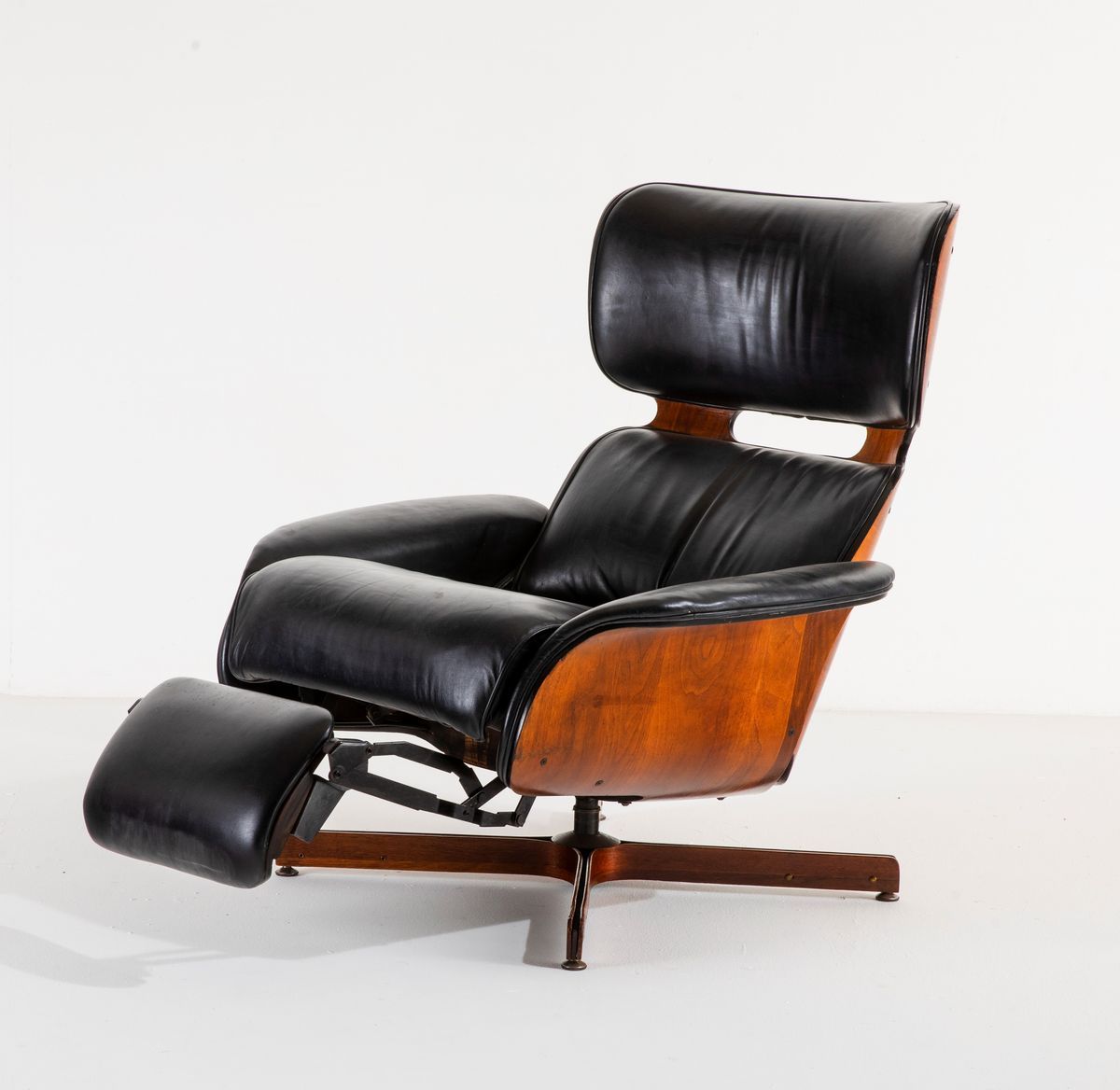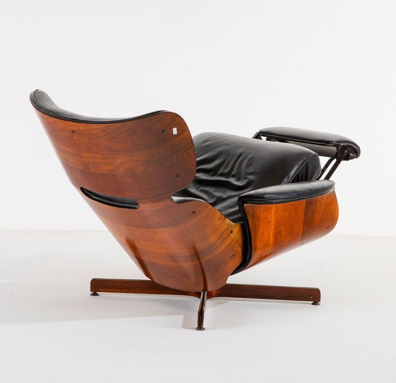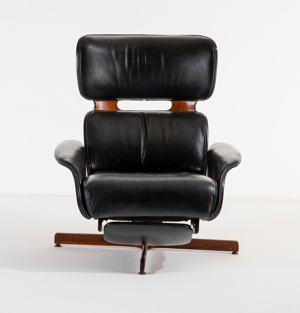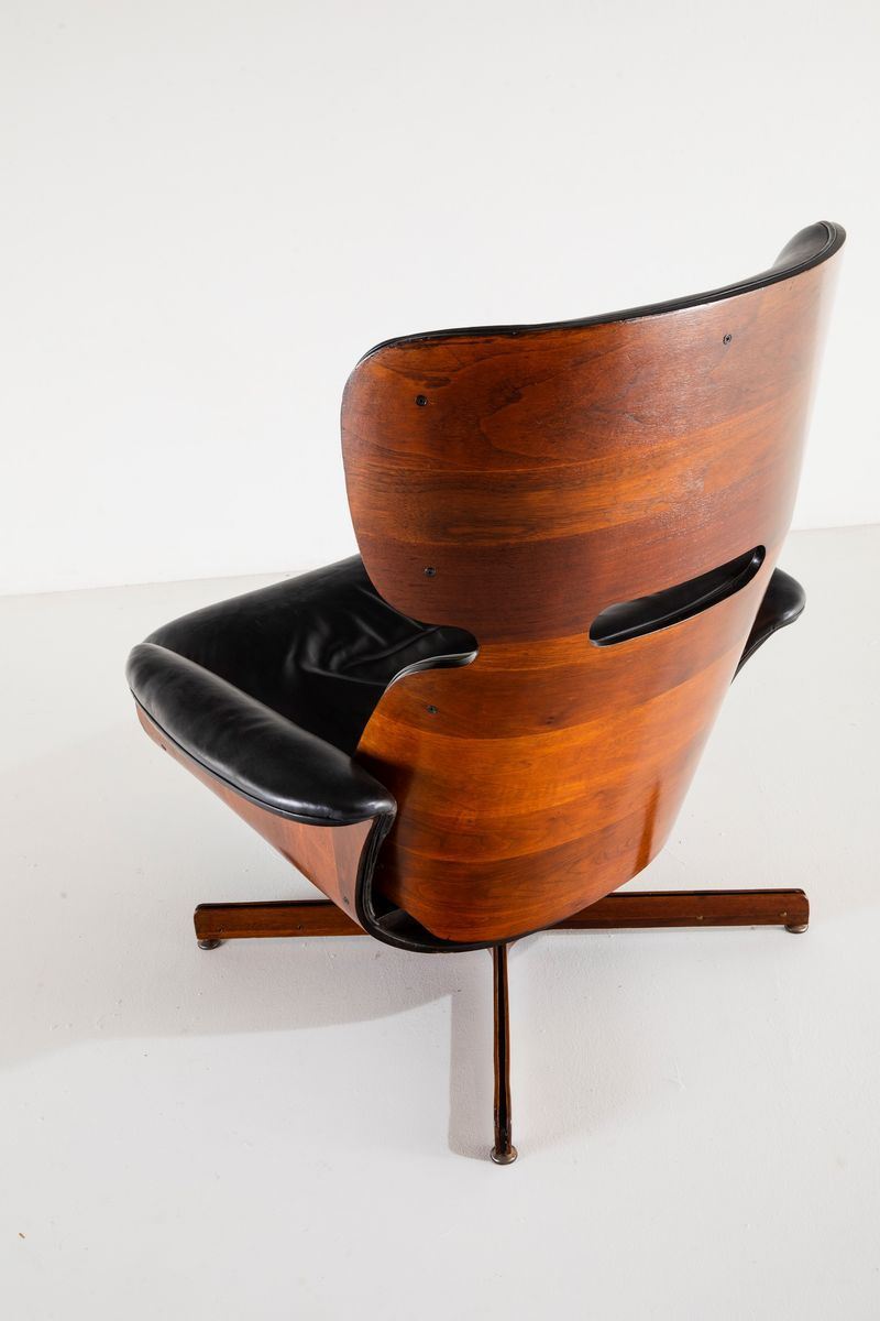 Poltrona con poggiapiedi estraibile con scocca in legno multistrato curvato, struttura in metallo, sostegni in legno e metallo e rivestimento in pelle.