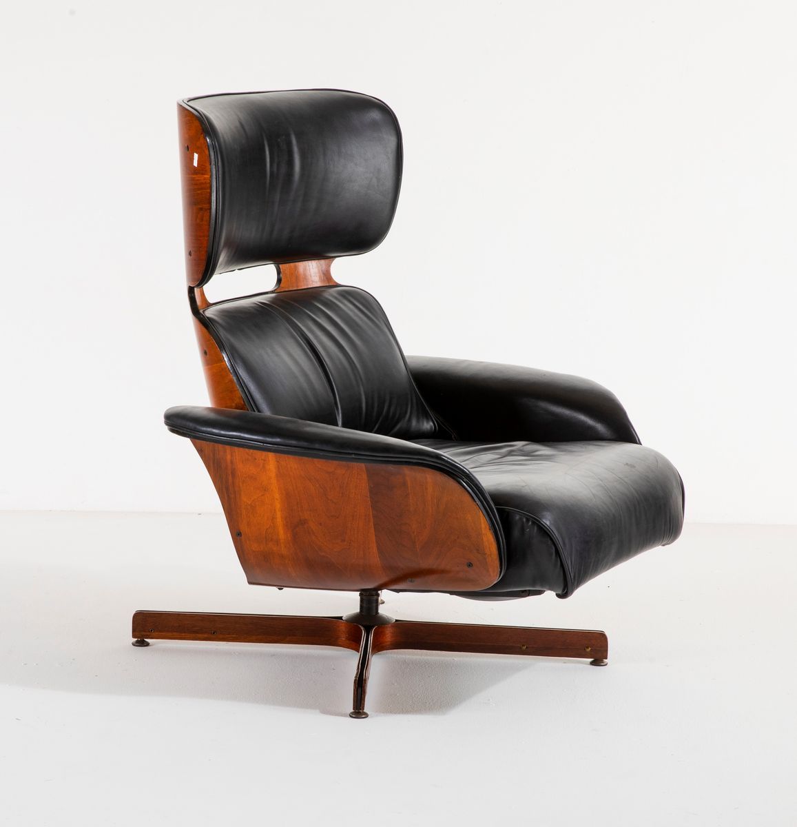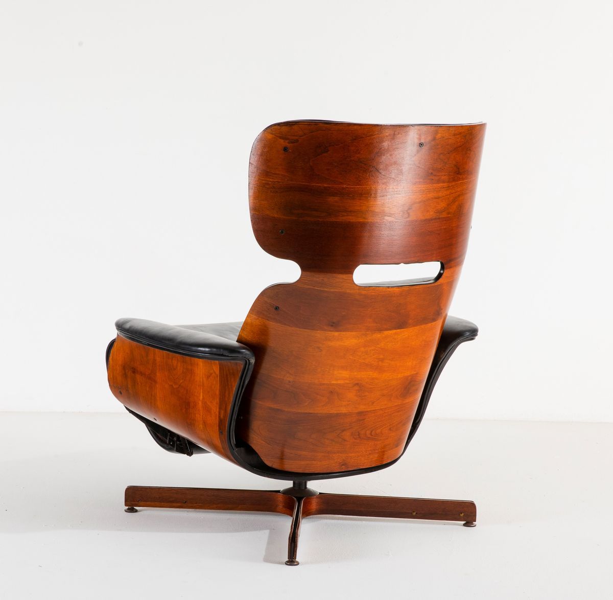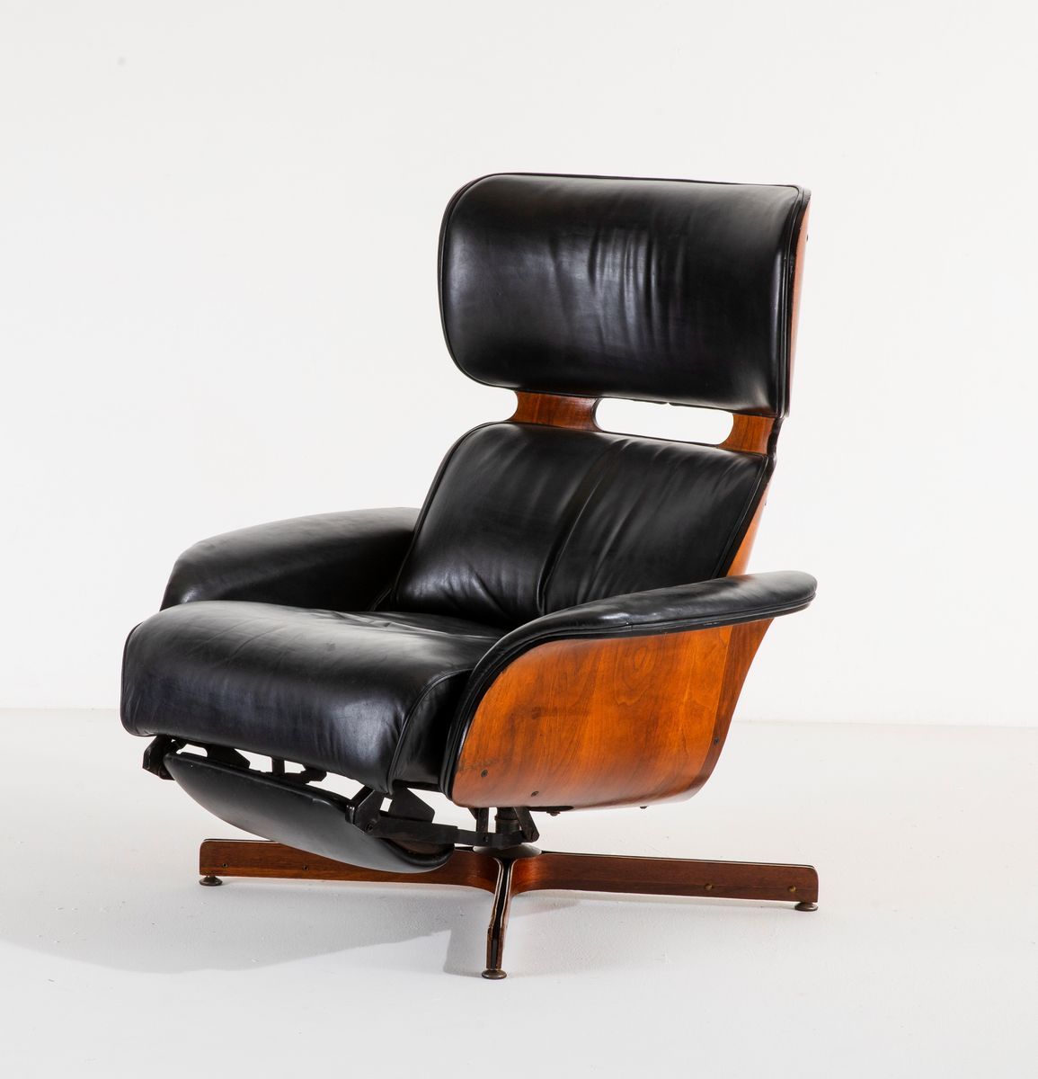 Poltrona con poggiapiedi estraibile con scocca in legno multistrato curvato, struttura in metallo, sostegni in legno e metallo e rivestimento in pelle.