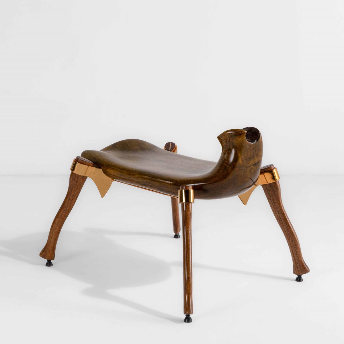 Corpo in legno massello intagliato e sostegni in legno con elementi in rame.