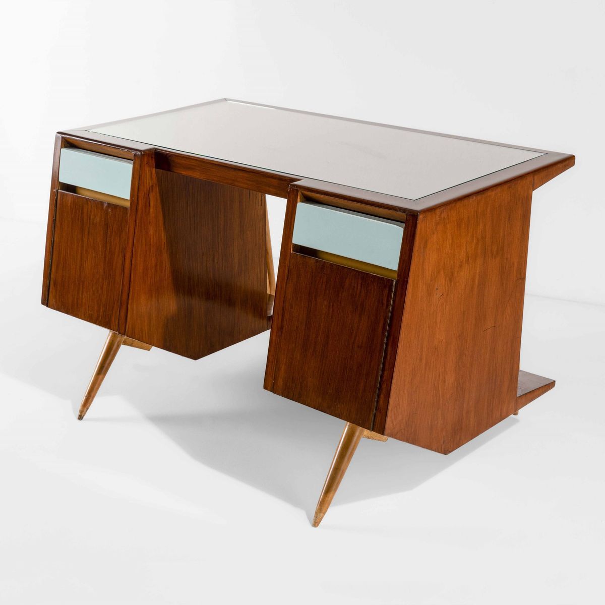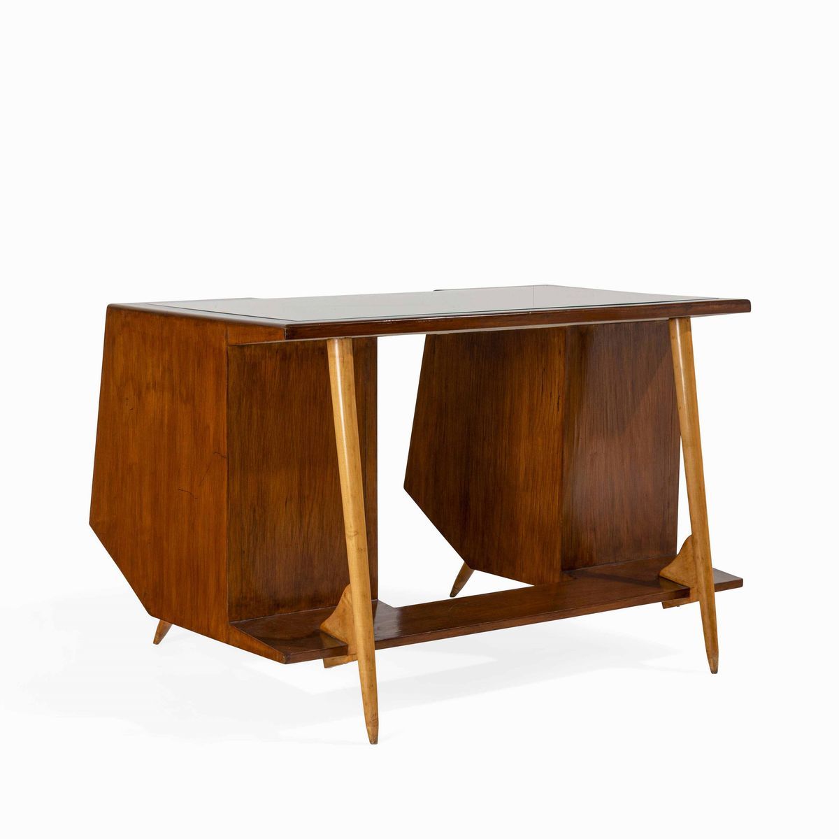 Scrivania con struttura e cassetti in legno e legno laccato. Piano in cristallo molato e legno, sostegni in legno tornito.