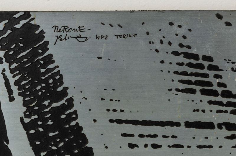 Pannello PTZ2 in metallo con decoro inciso nero su zinco.