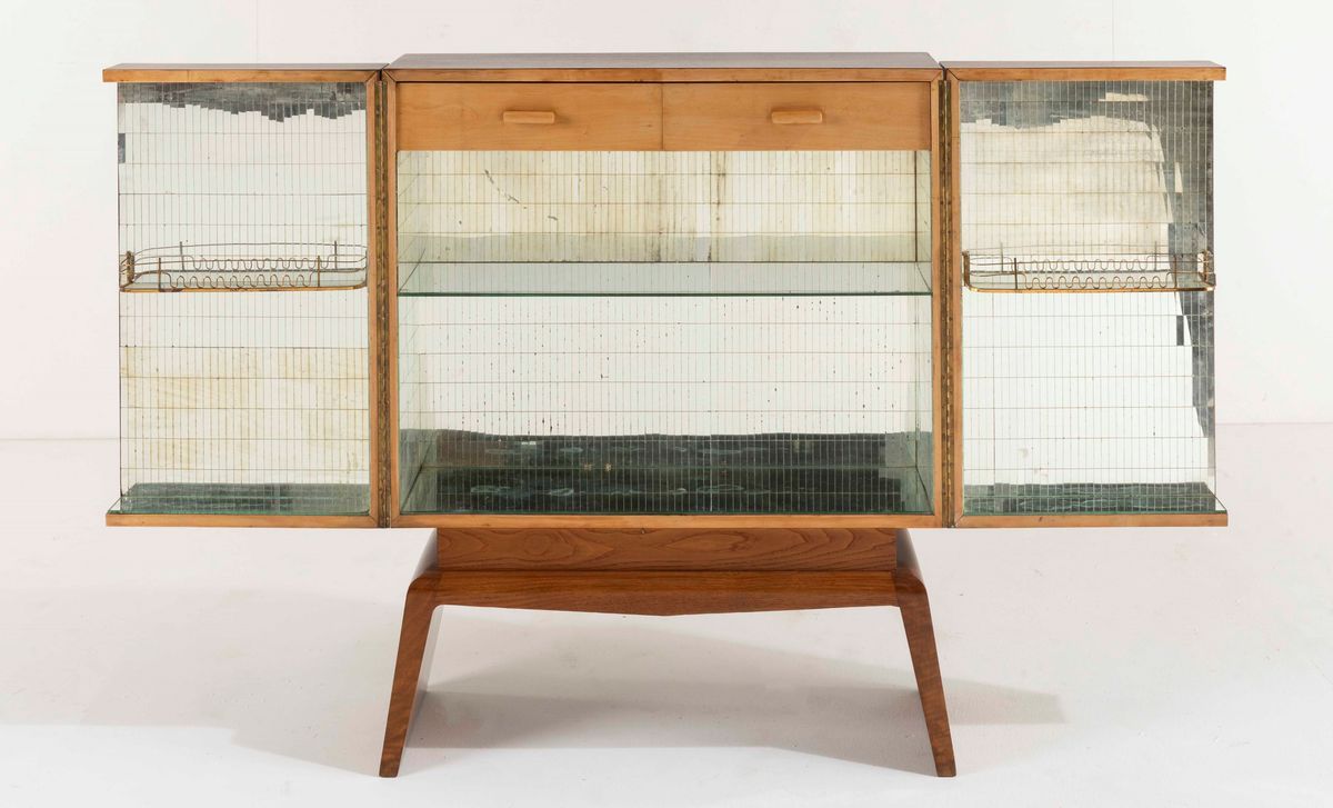 Mobile bar con struttura in legno e rivestimenti in legno grissinato. Rivestimenti interni a mosaico di cristallo specchiato e particolari in ottone.