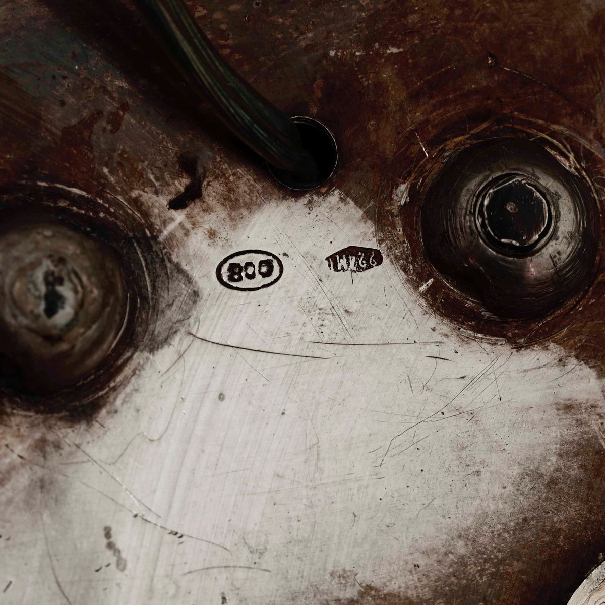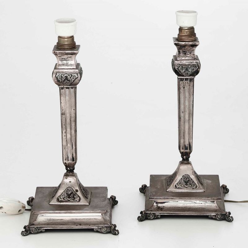Coppia di candelieri in argento fuso e cesellato. Argenteria artistica milanese del XX secolo. Argentiere De Vecchi