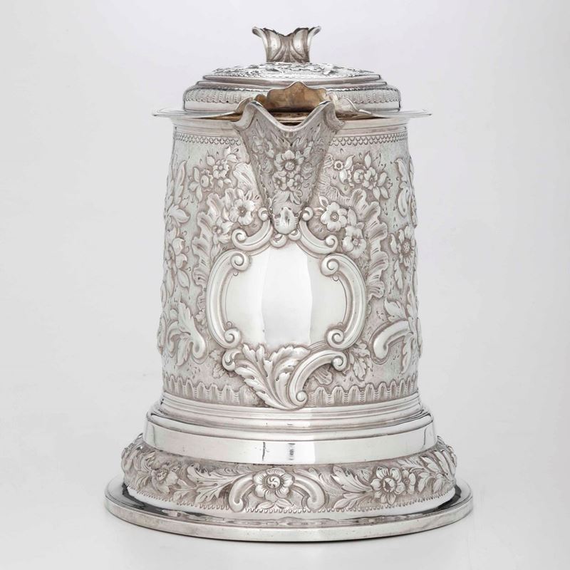 Grande tankard. Argento fuso, sbalzato e dorato. Inghilterra XIX-XX secolo, marchi della città di Londra per l’anno 1697, [..]