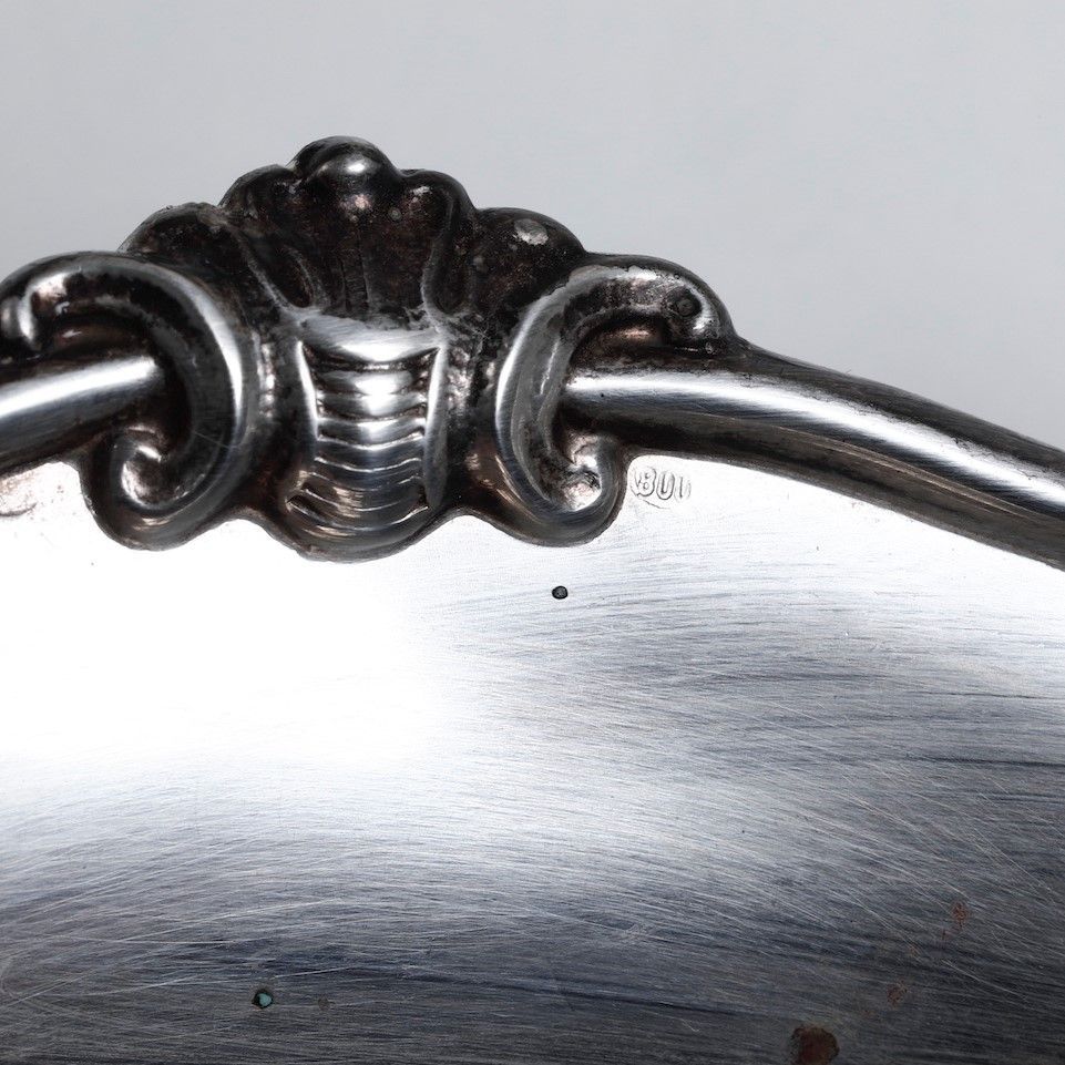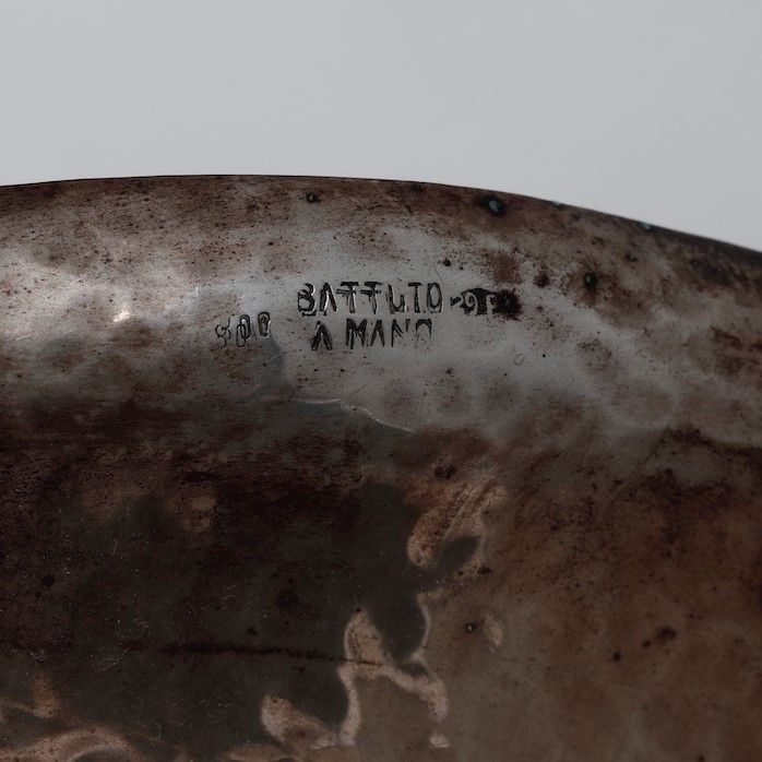 Vassoio e coppetta in argento. Argenteria artistica milanese del XX secolo. Argentiere Miracoli