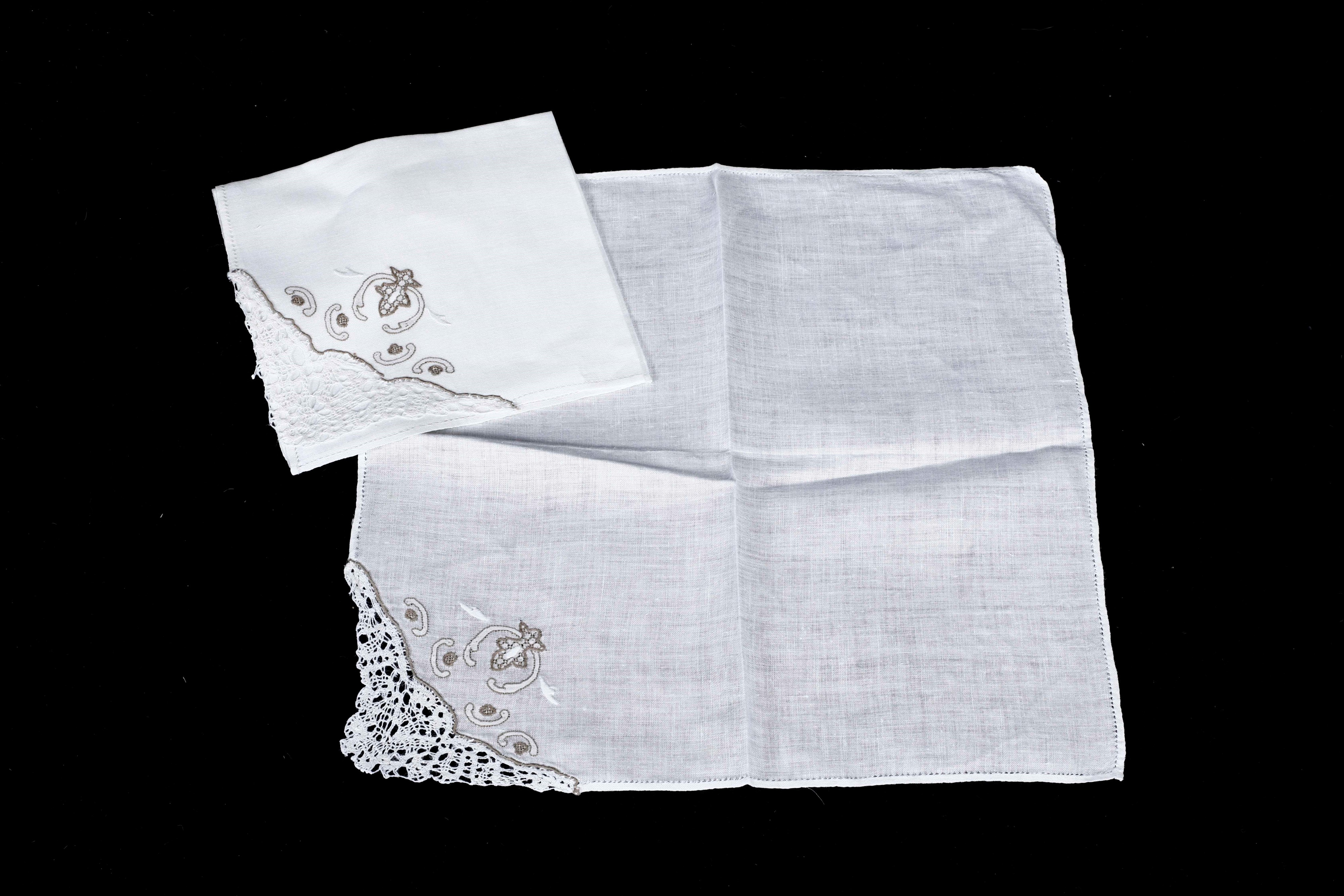 Lino ricamato e con pizzo. Dimensioni: tovaglia cm 350x170; tovaglioli cm 42x42