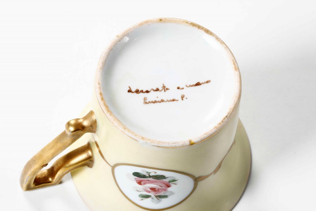 Porcellana policroma e dorata. Marca: assente; "Decorata a mano Luciana P." Dimensioni: altezza tazza cm 7; diametro piattino cm 13,8. Conservazione: ottima; 1 tazza con sbeccatura al bordo superiore